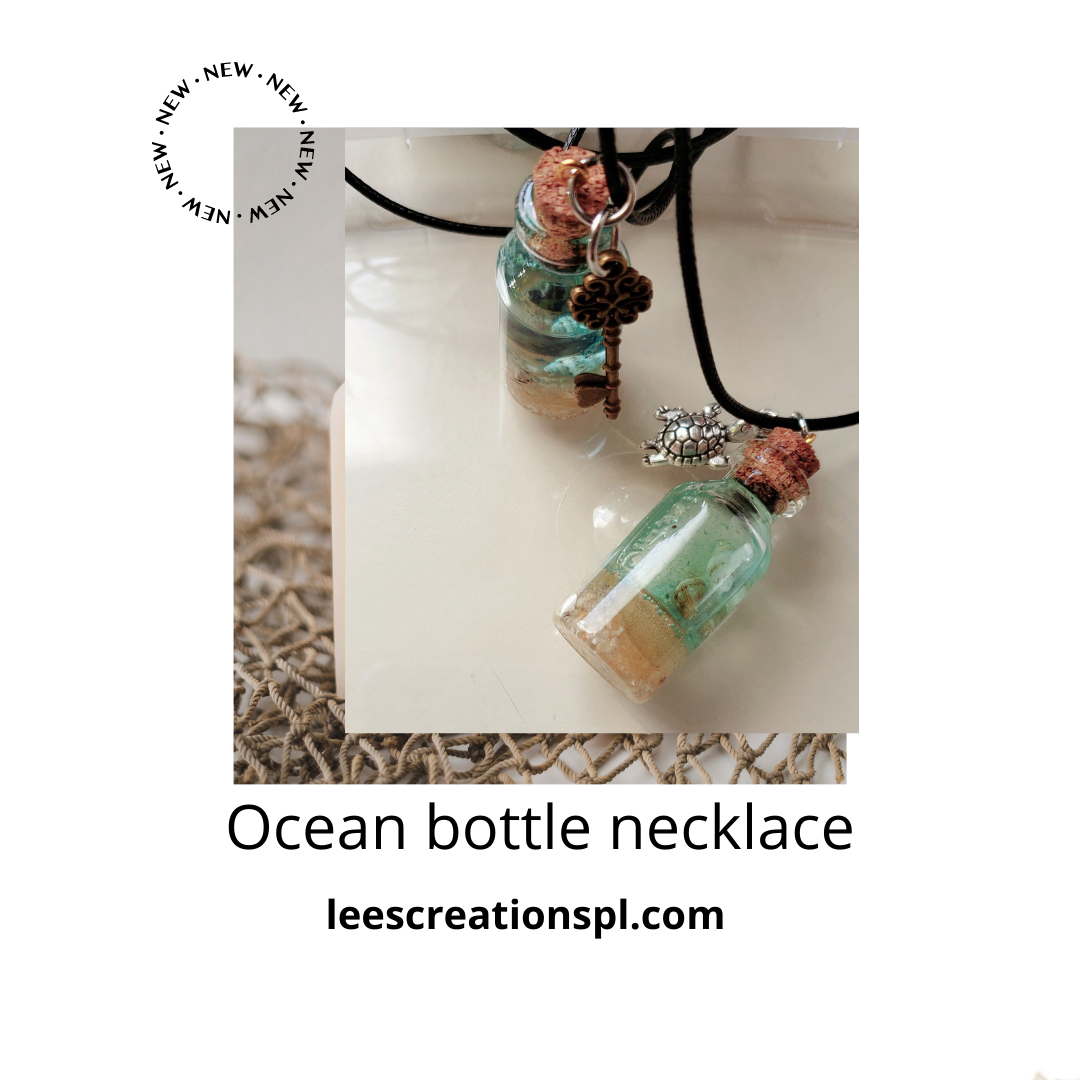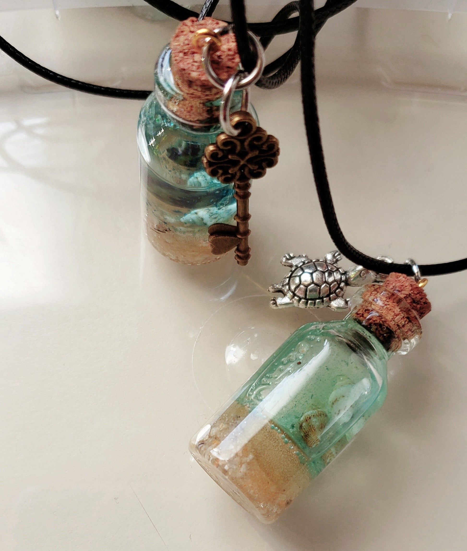 This ocean scenery bottle necklace features mini glass bottles with a blend of water, sand, seashells and resin, artfully arranged to create a breathtaking underwater seascape. The captivating design makes a unique statement piece, ideal for any beach or ocean-inspired outfit.