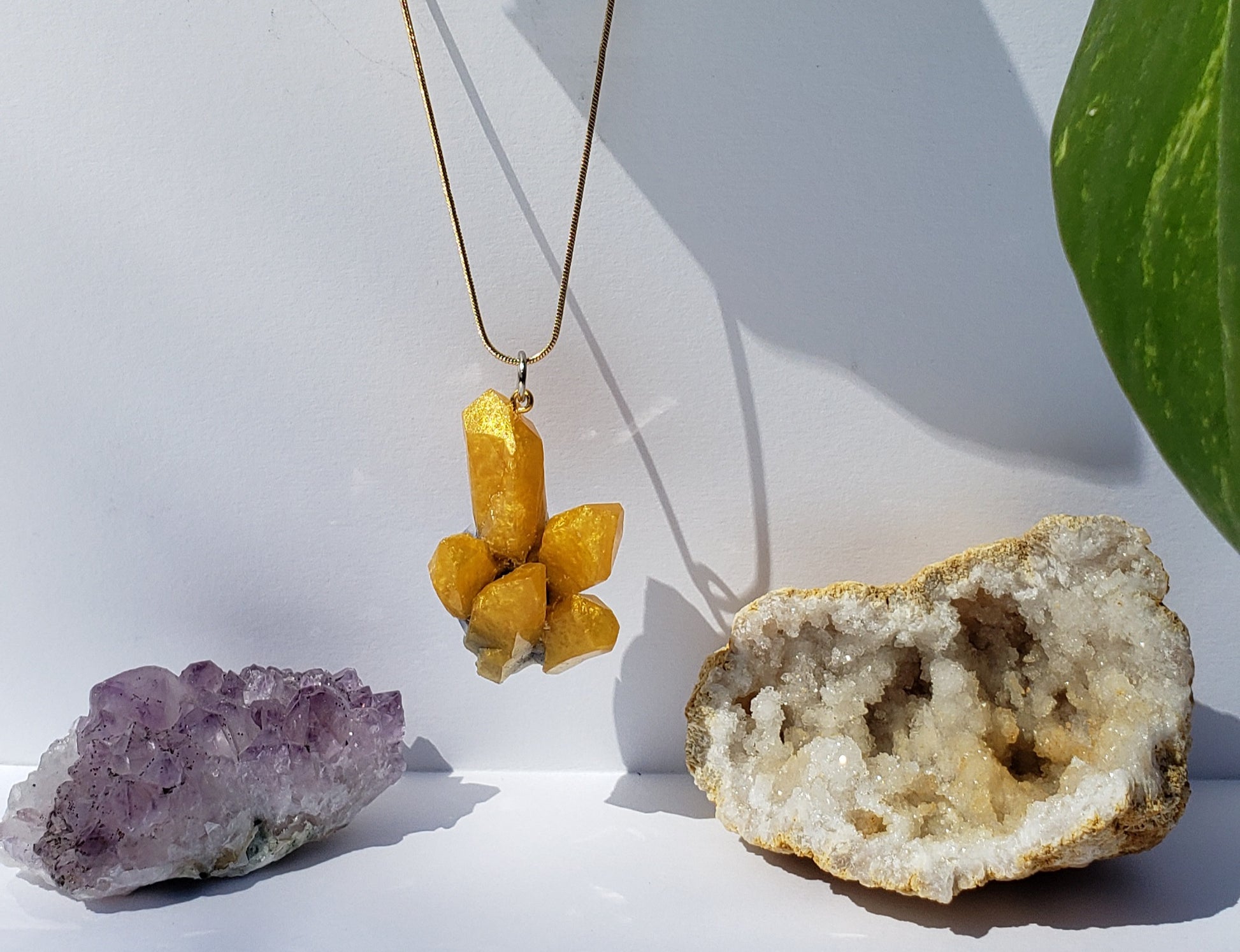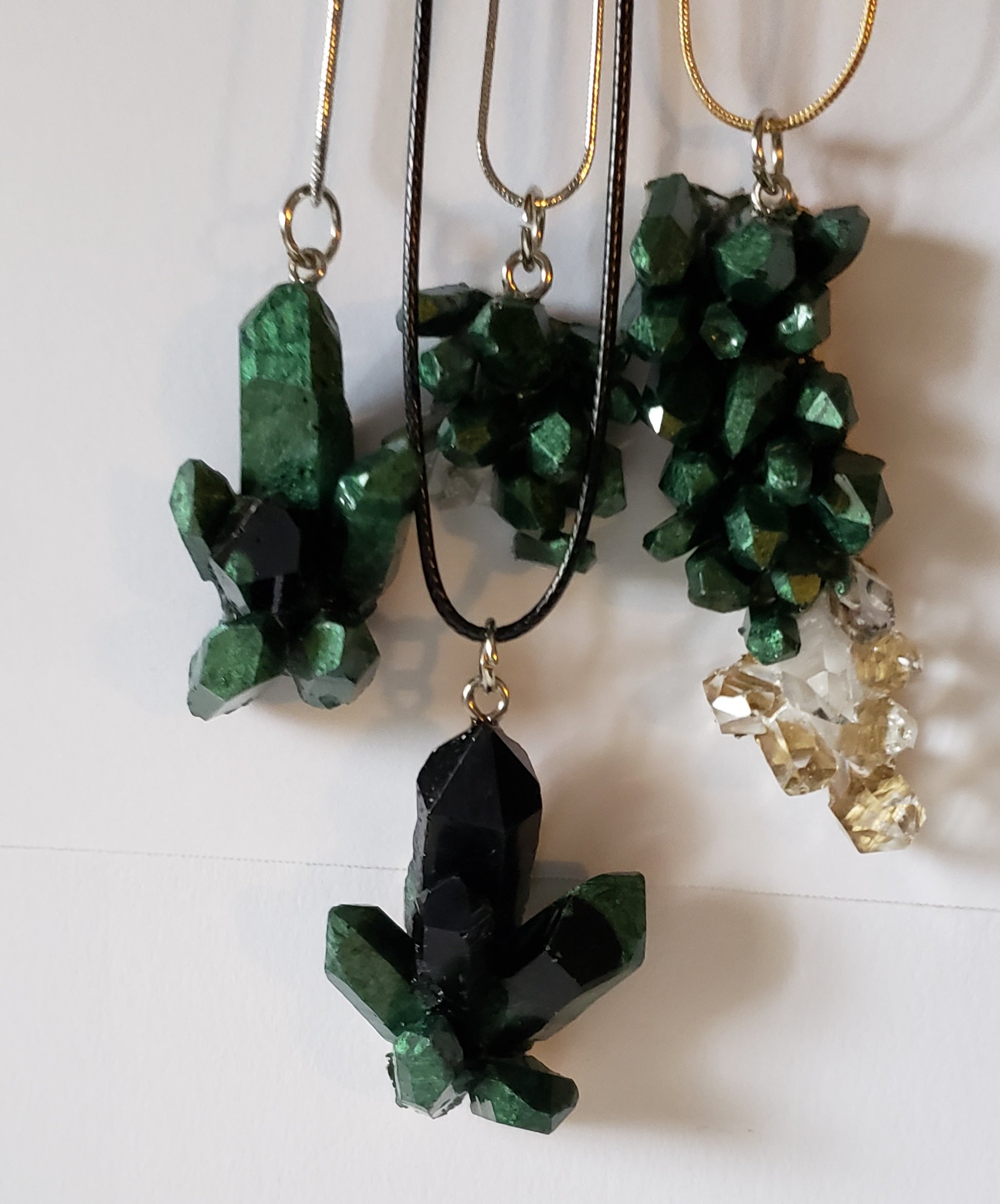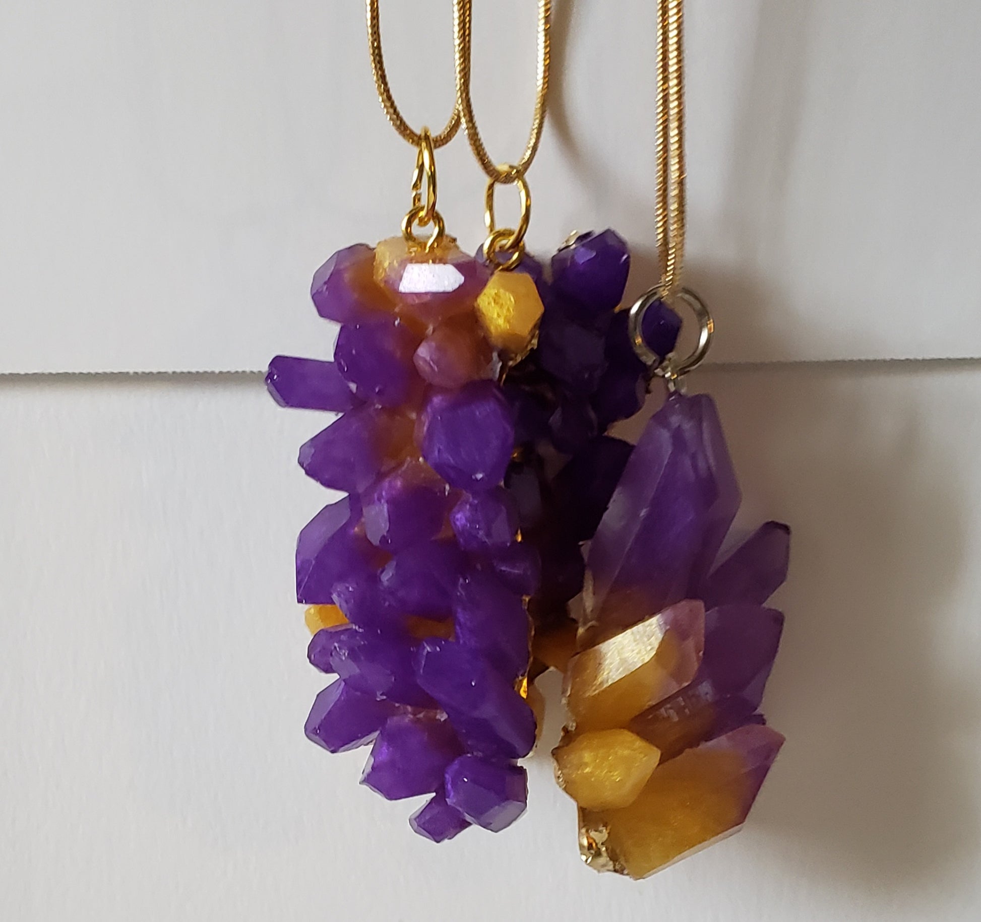 This intricately designed necklace is a beautiful statement piece. It features a resin crystal cluster made from epoxy resin, molded to resemble genuine crystal. Enjoy the beauty of real crystals without the cost.