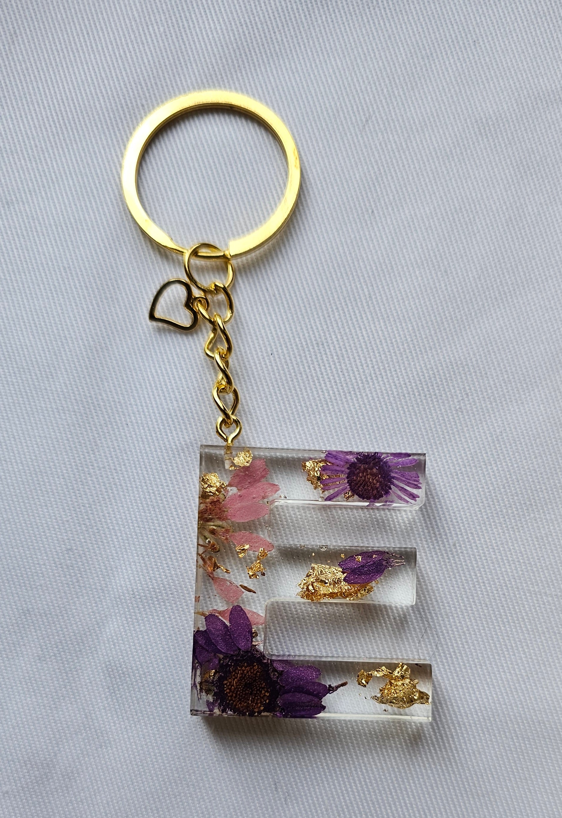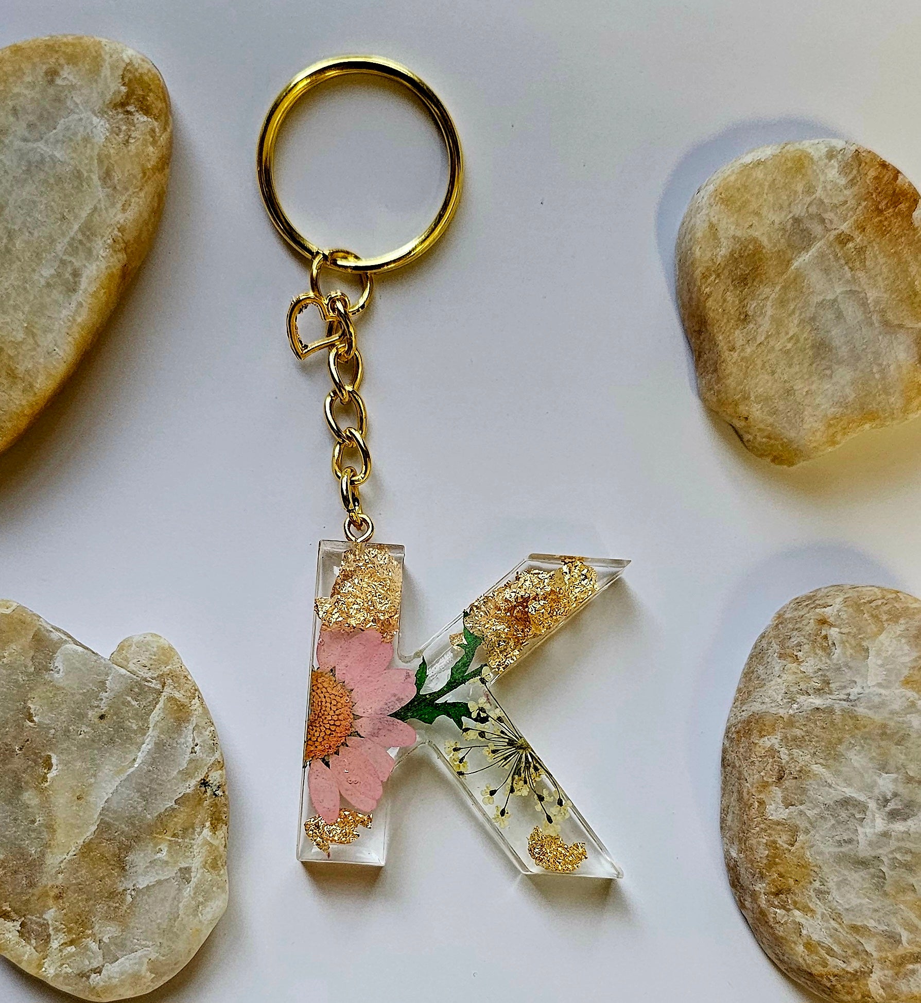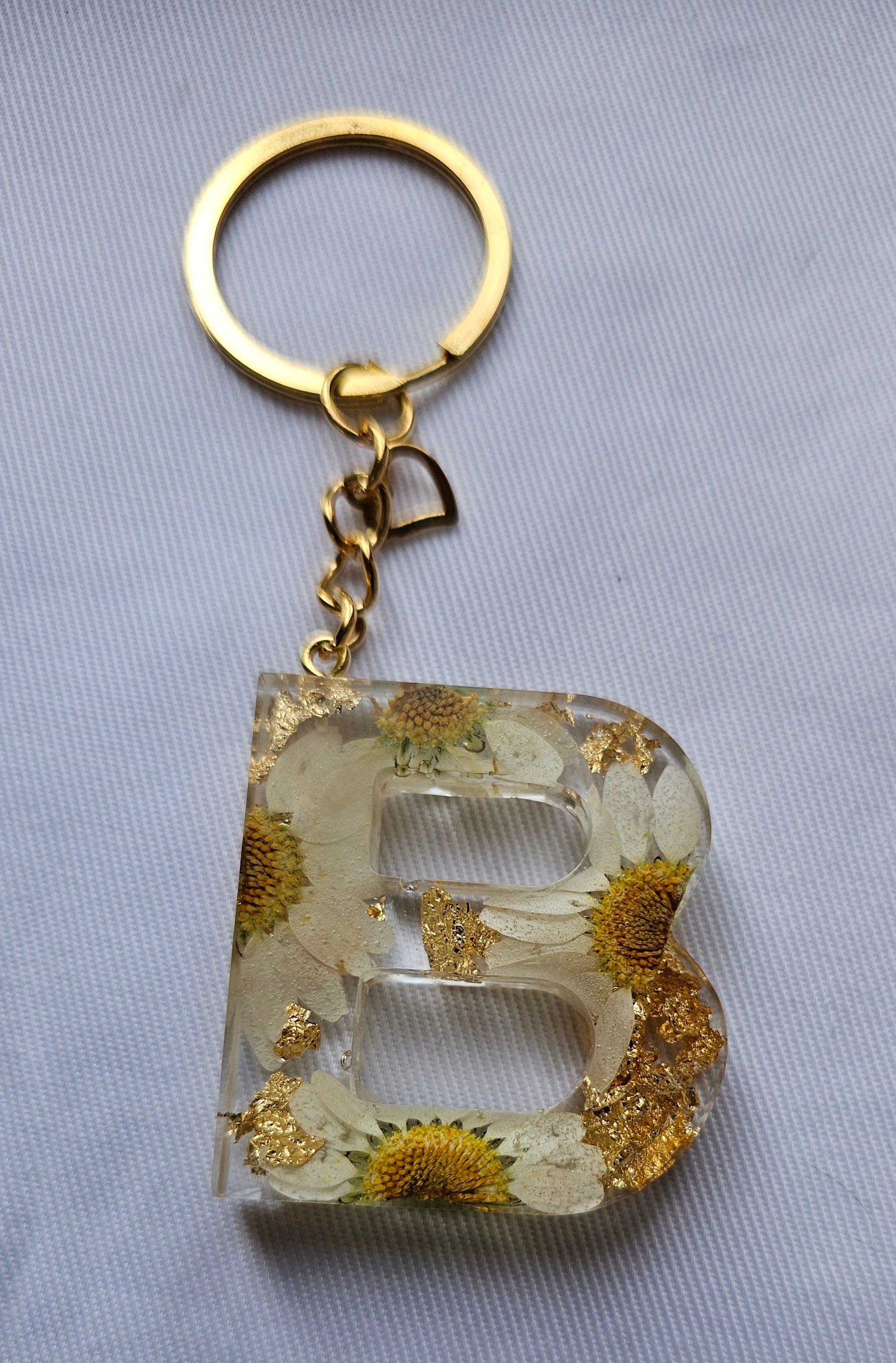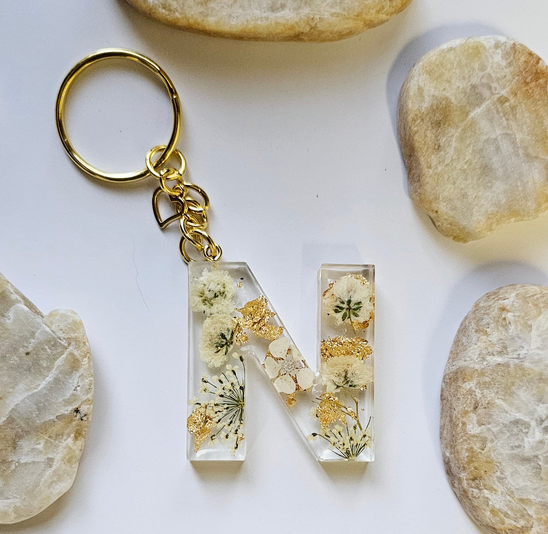Make a unique statement with a custom Floral Letter Keychain! Handcrafted with real flowers, gold flakes, and clear resin, each one-of-a-kind keychain is an eye-catching accessory. Choose your favorite letter or number for a personalized touch. The perfect gift for stocking stuffers, bridesmaids, and birthdays. Includes one keychain with attached gold chain. Optionally add small leaves and flowers.