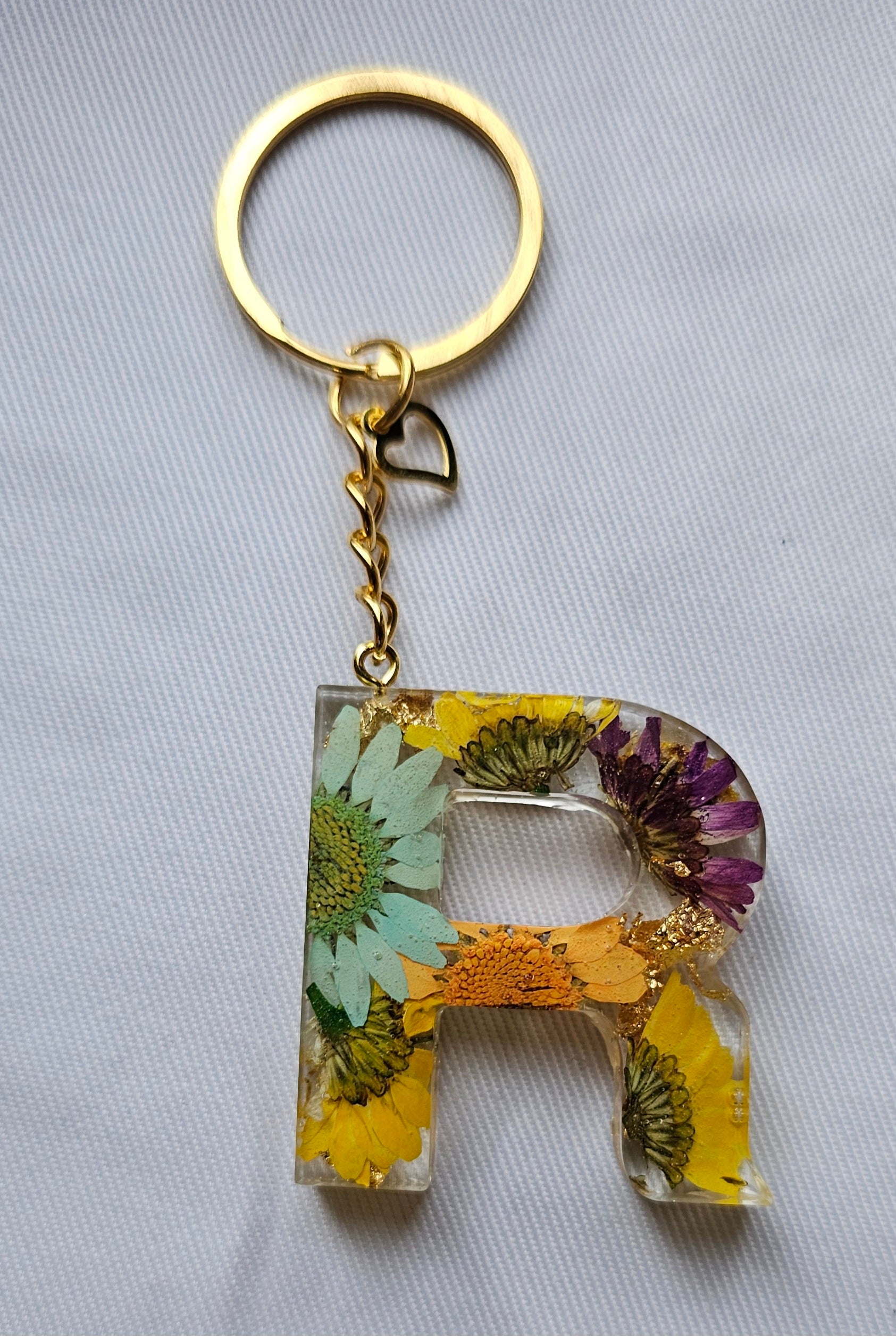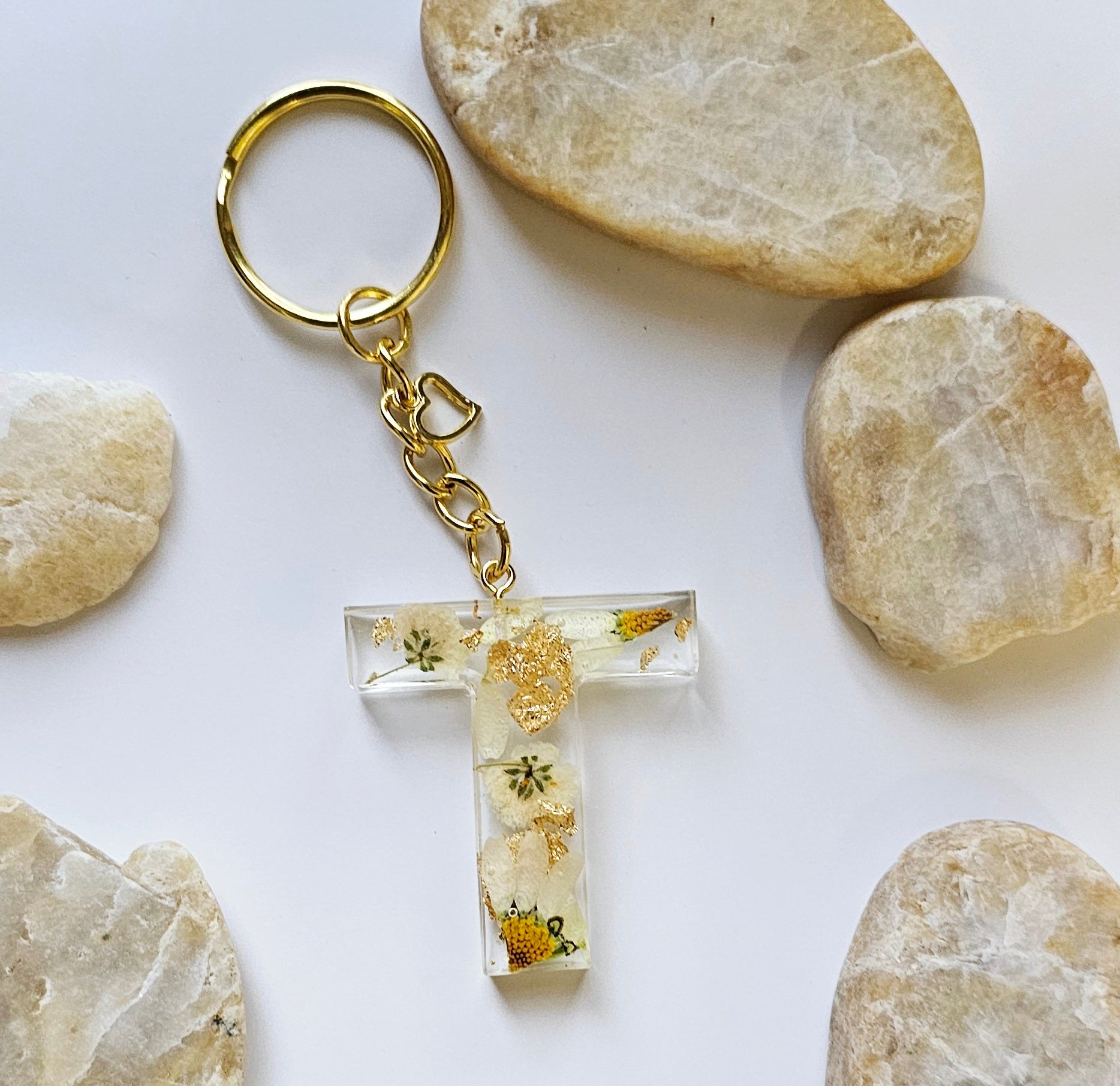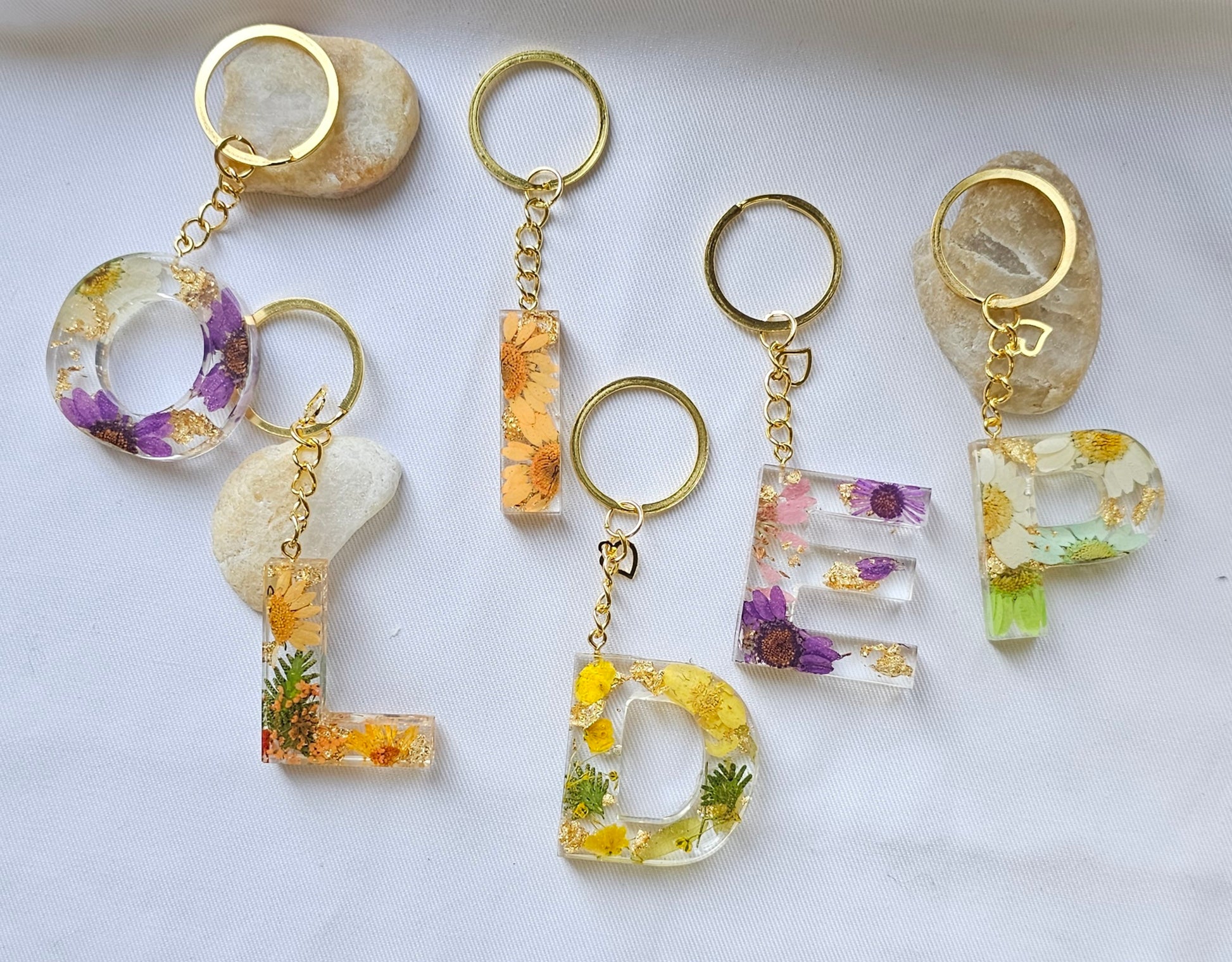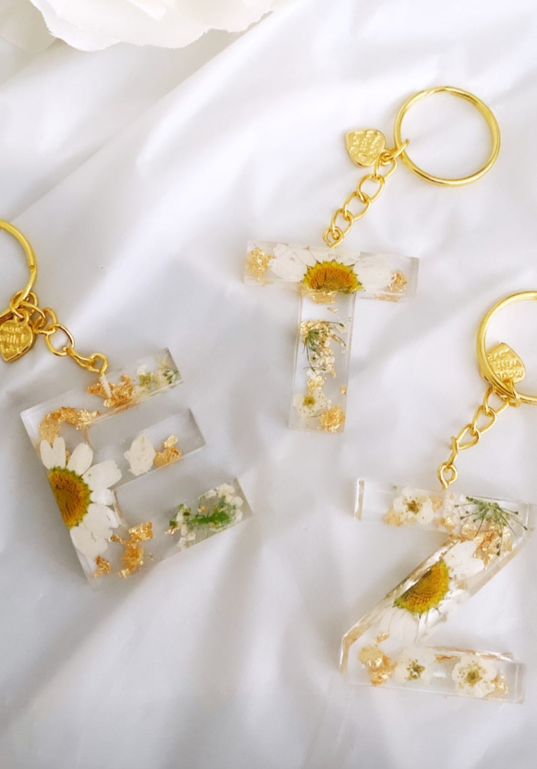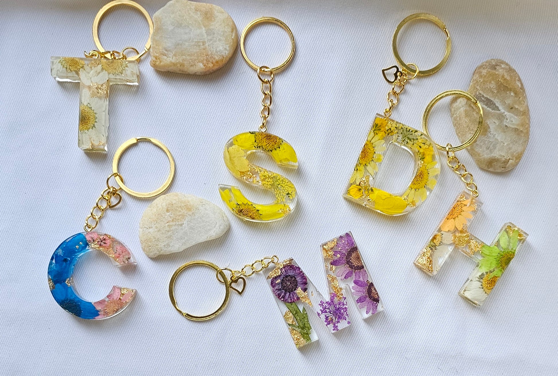 Make a unique statement with a custom Floral Letter Keychain! Handcrafted with real flowers, gold flakes, and clear resin, each one-of-a-kind keychain is an eye-catching accessory. Choose your favorite letter or number for a personalized touch. The perfect gift for stocking stuffers, bridesmaids, and birthdays. Includes one keychain with attached gold chain. Optionally add small leaves and flowers.