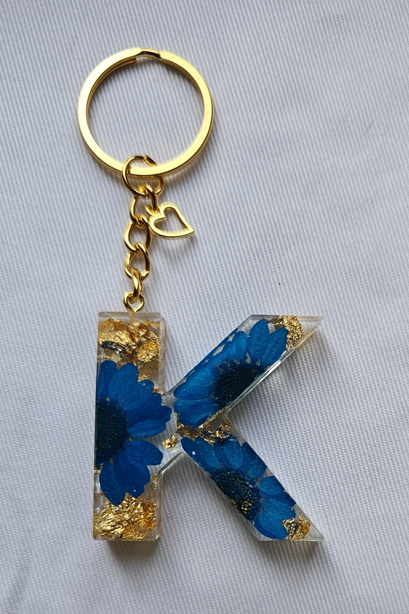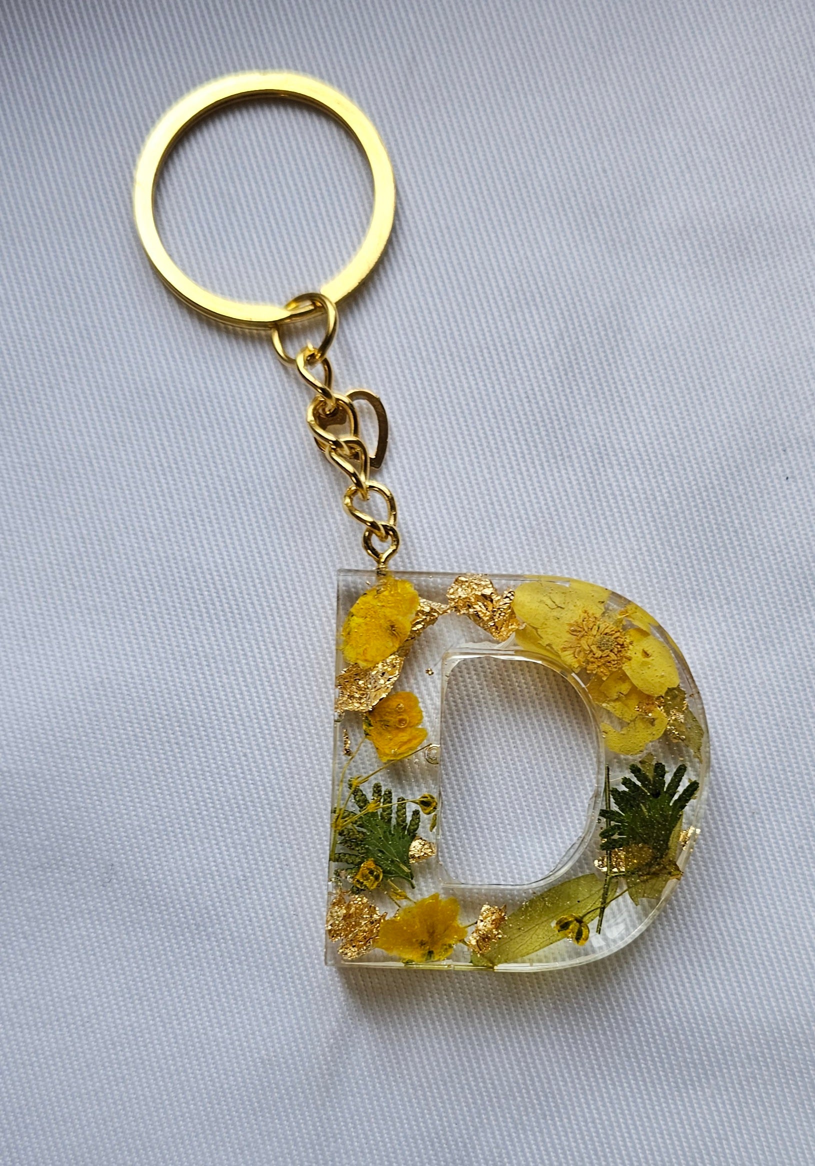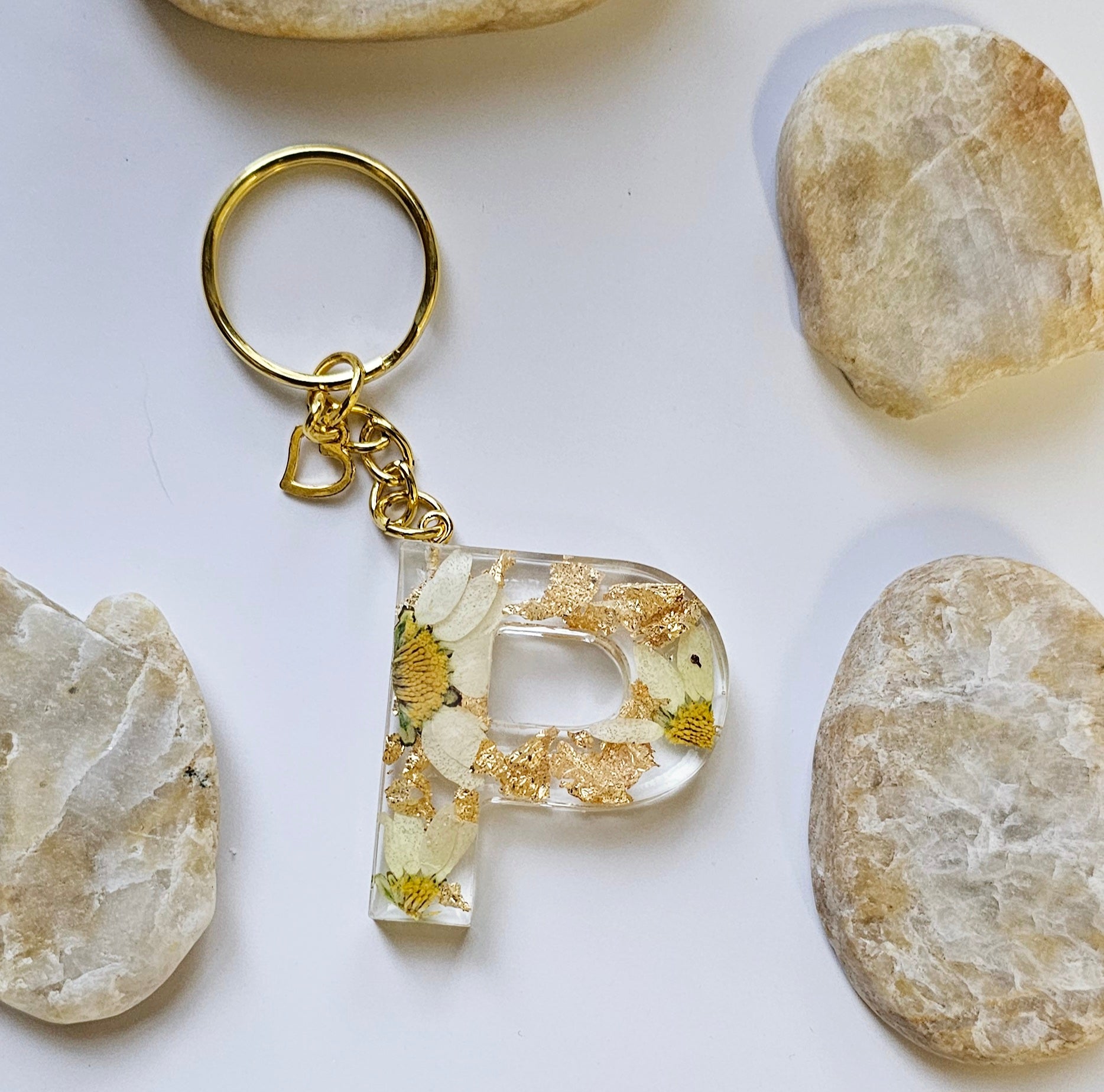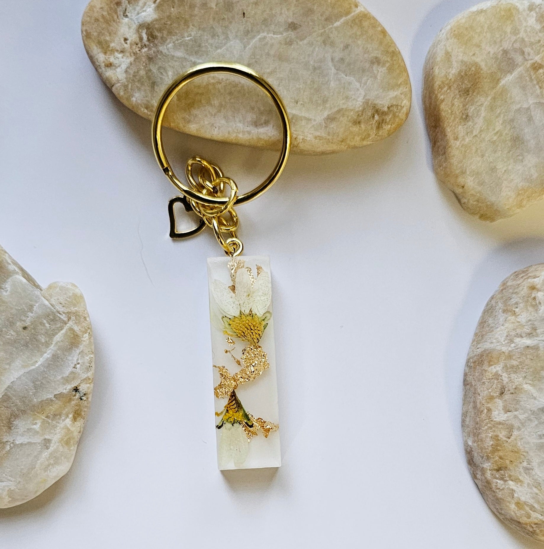 Make a unique statement with a custom Floral Letter Keychain! Handcrafted with real flowers, gold flakes, and clear resin, each one-of-a-kind keychain is an eye-catching accessory. Choose your favorite letter or number for a personalized touch. The perfect gift for stocking stuffers, bridesmaids, and birthdays. Includes one keychain with attached gold chain. Optionally add small leaves and flowers.