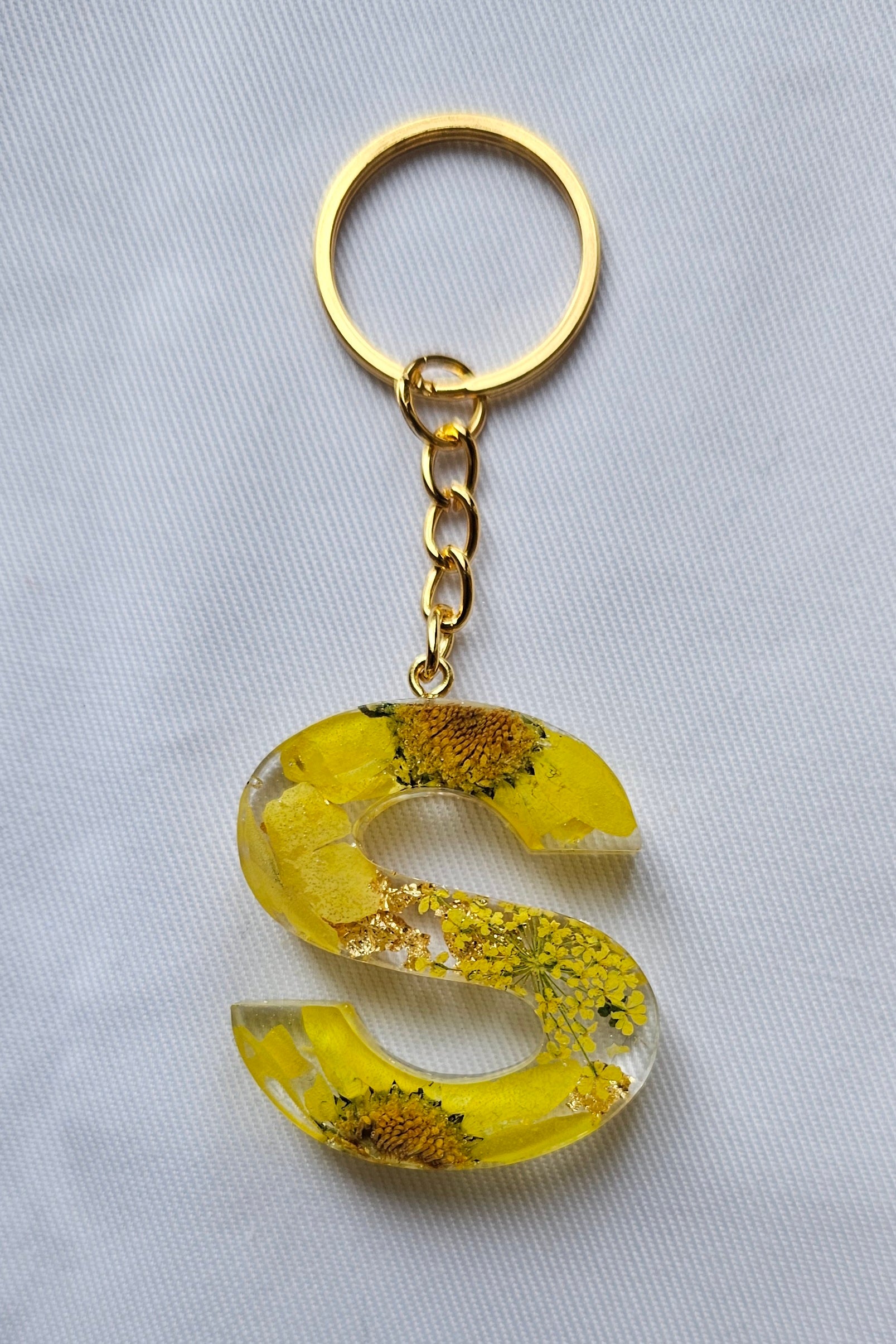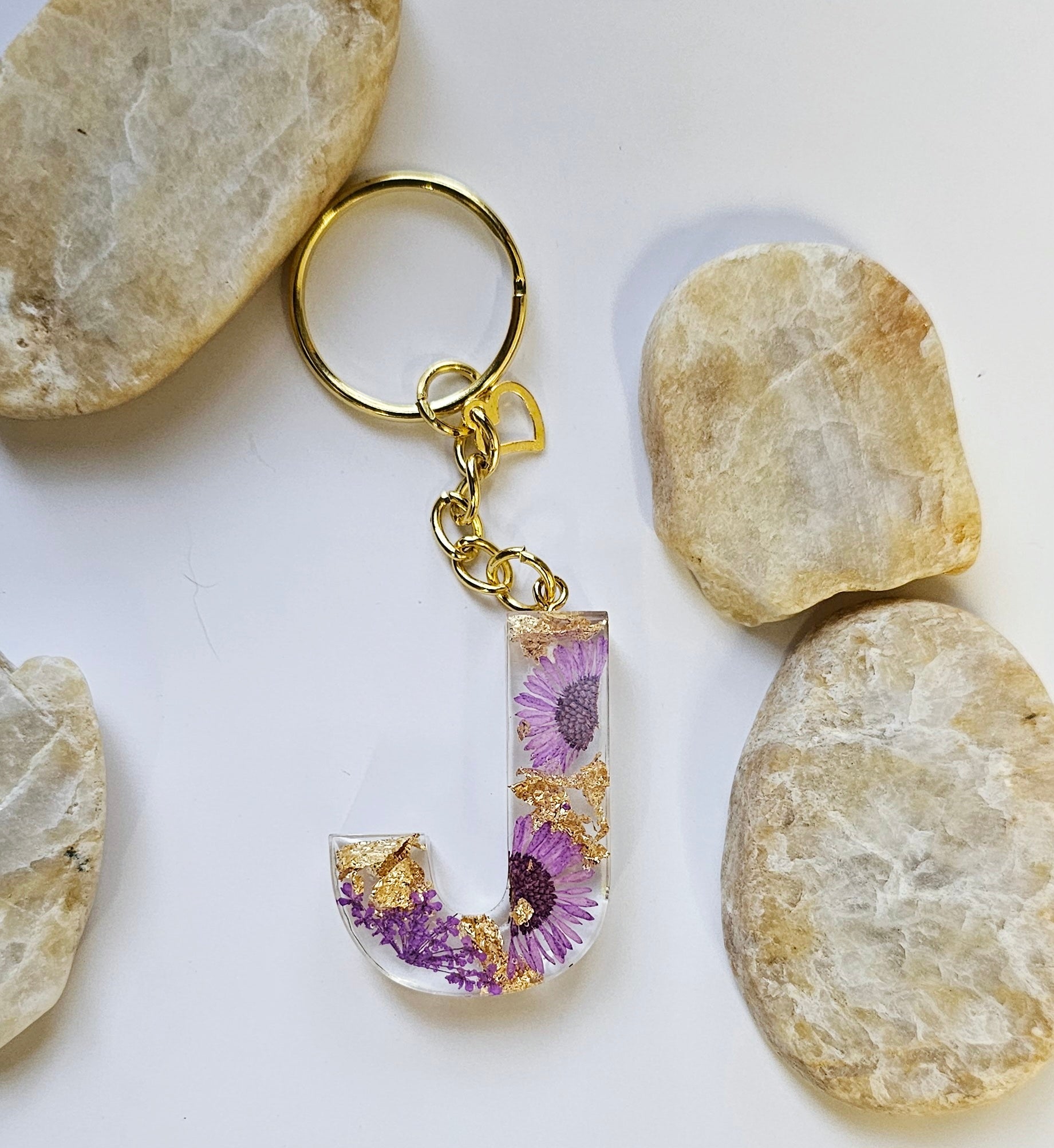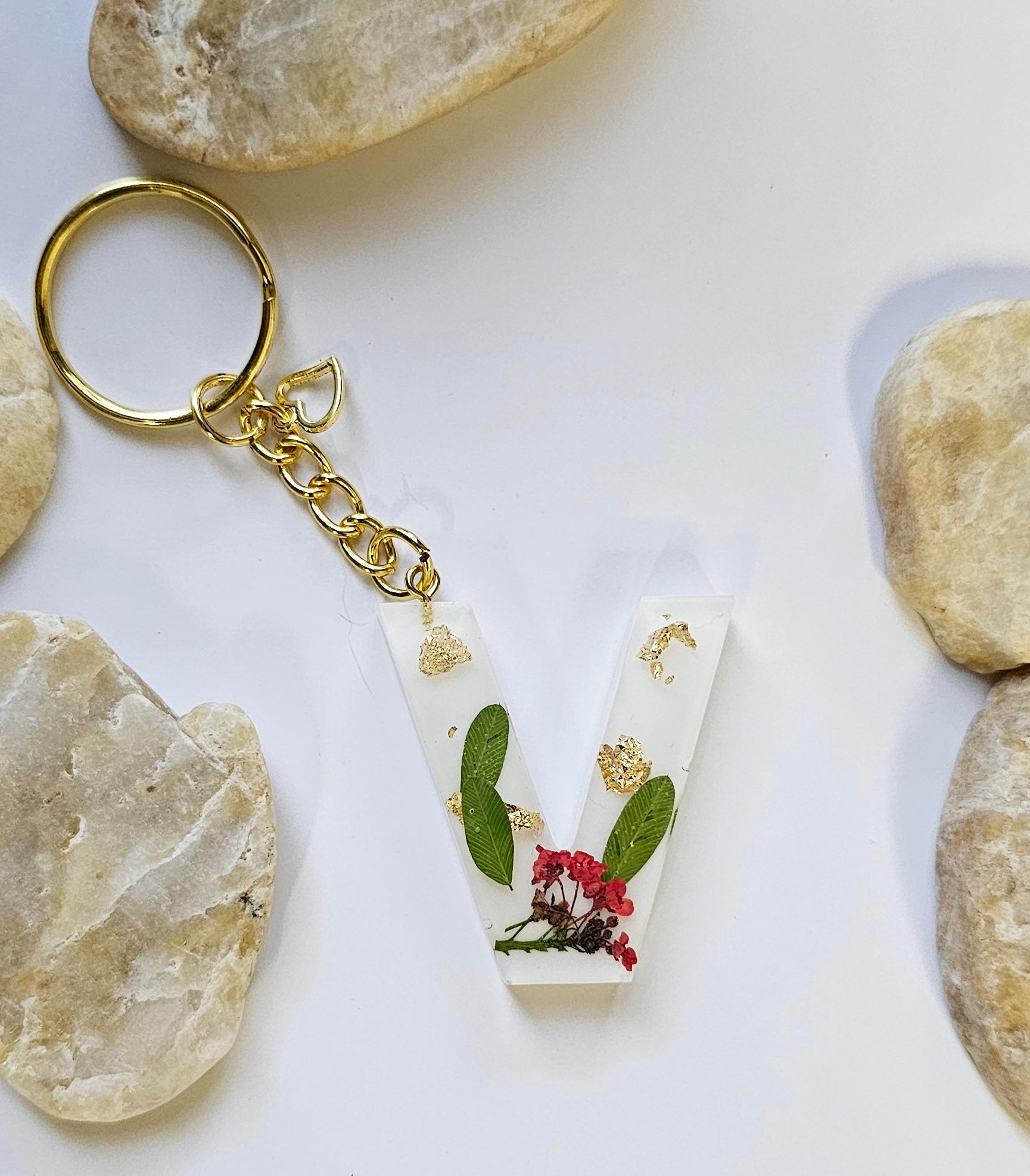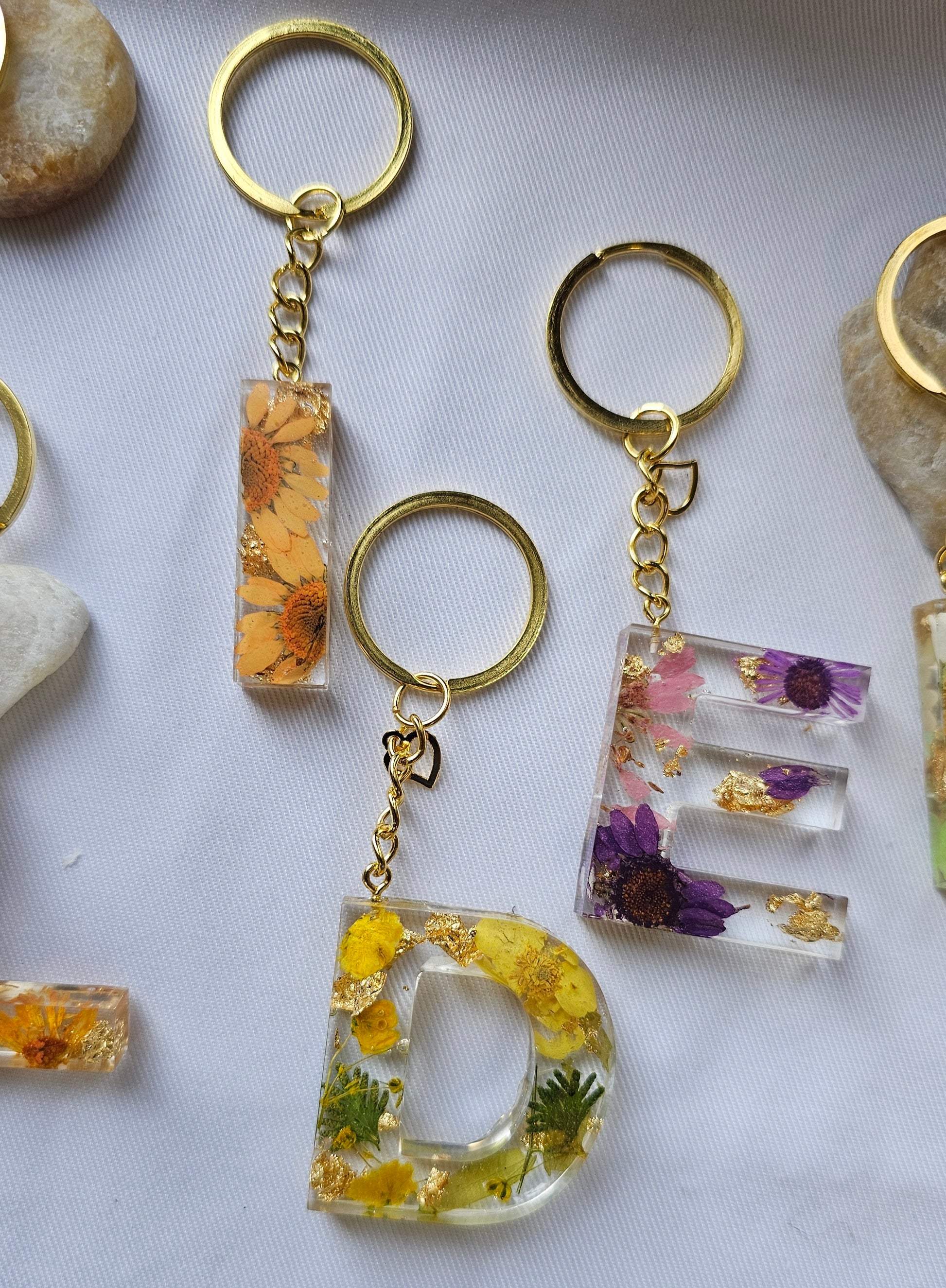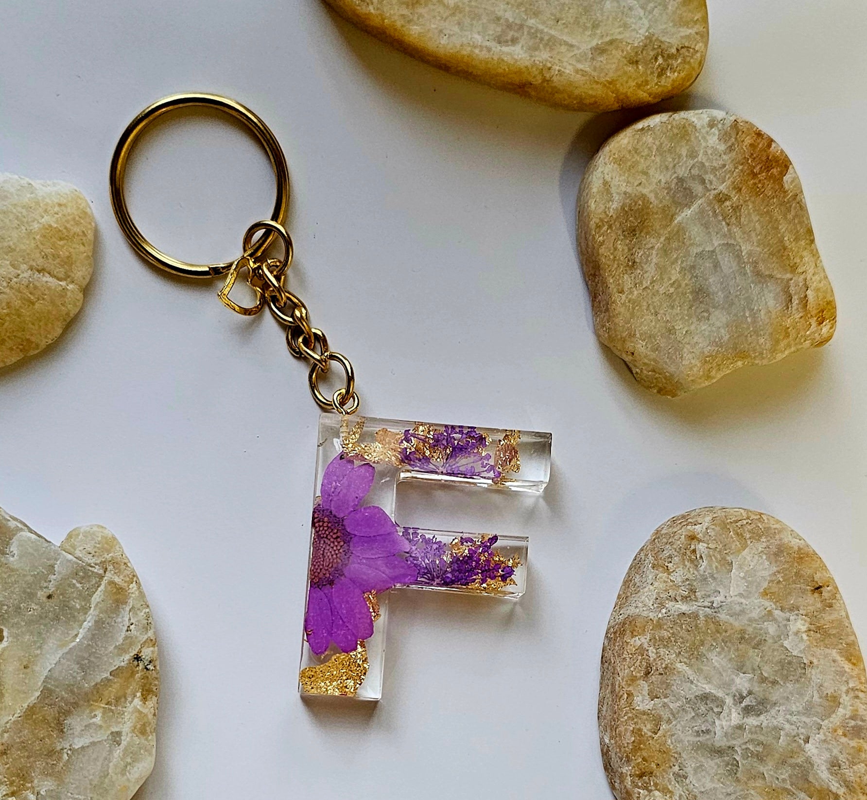 Make a unique statement with a custom Floral Letter Keychain! Handcrafted with real flowers, gold flakes, and clear resin, each one-of-a-kind keychain is an eye-catching accessory. Choose your favorite letter or number for a personalized touch. The perfect gift for stocking stuffers, bridesmaids, and birthdays. Includes one keychain with attached gold chain. Optionally add small leaves and flowers.