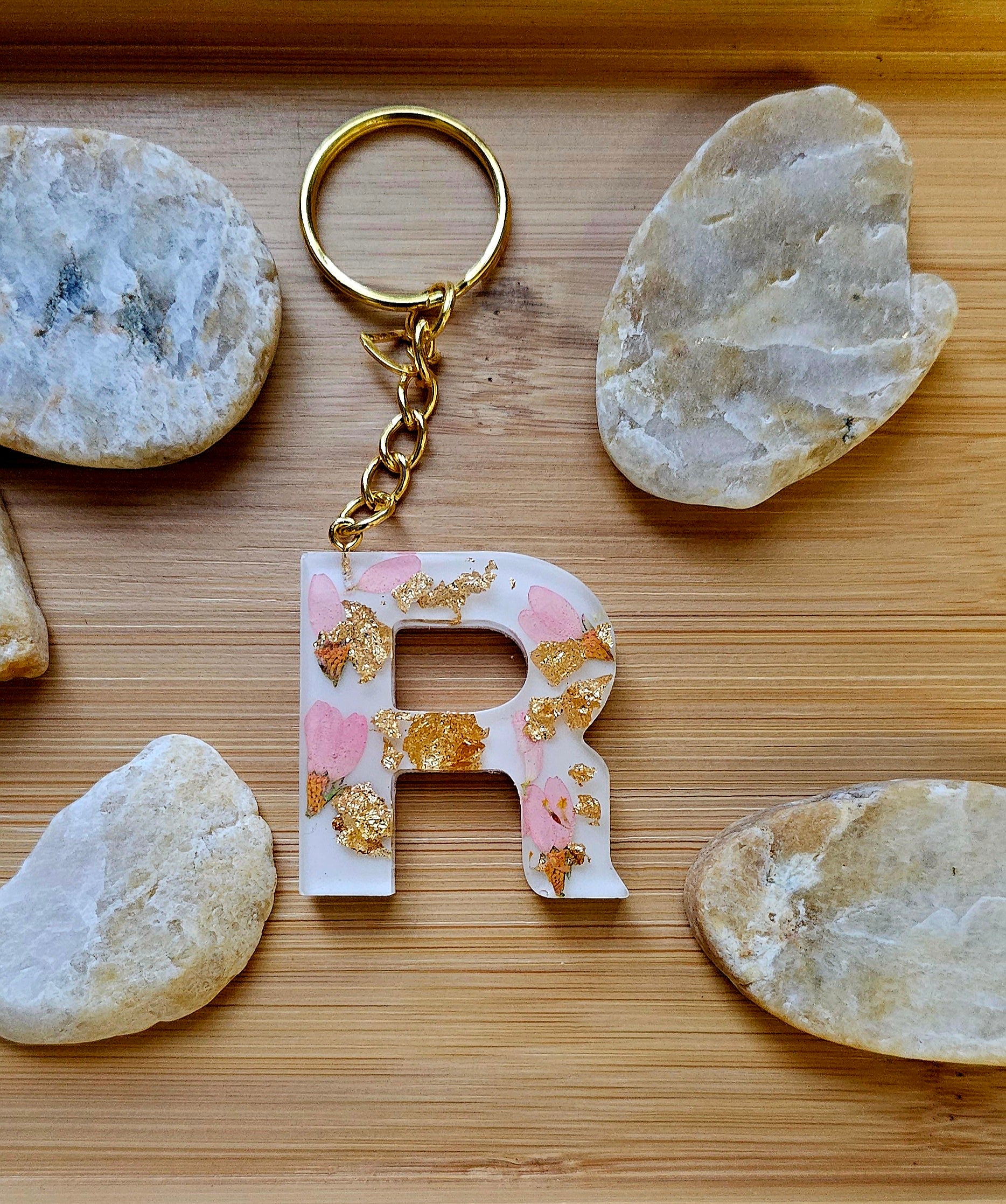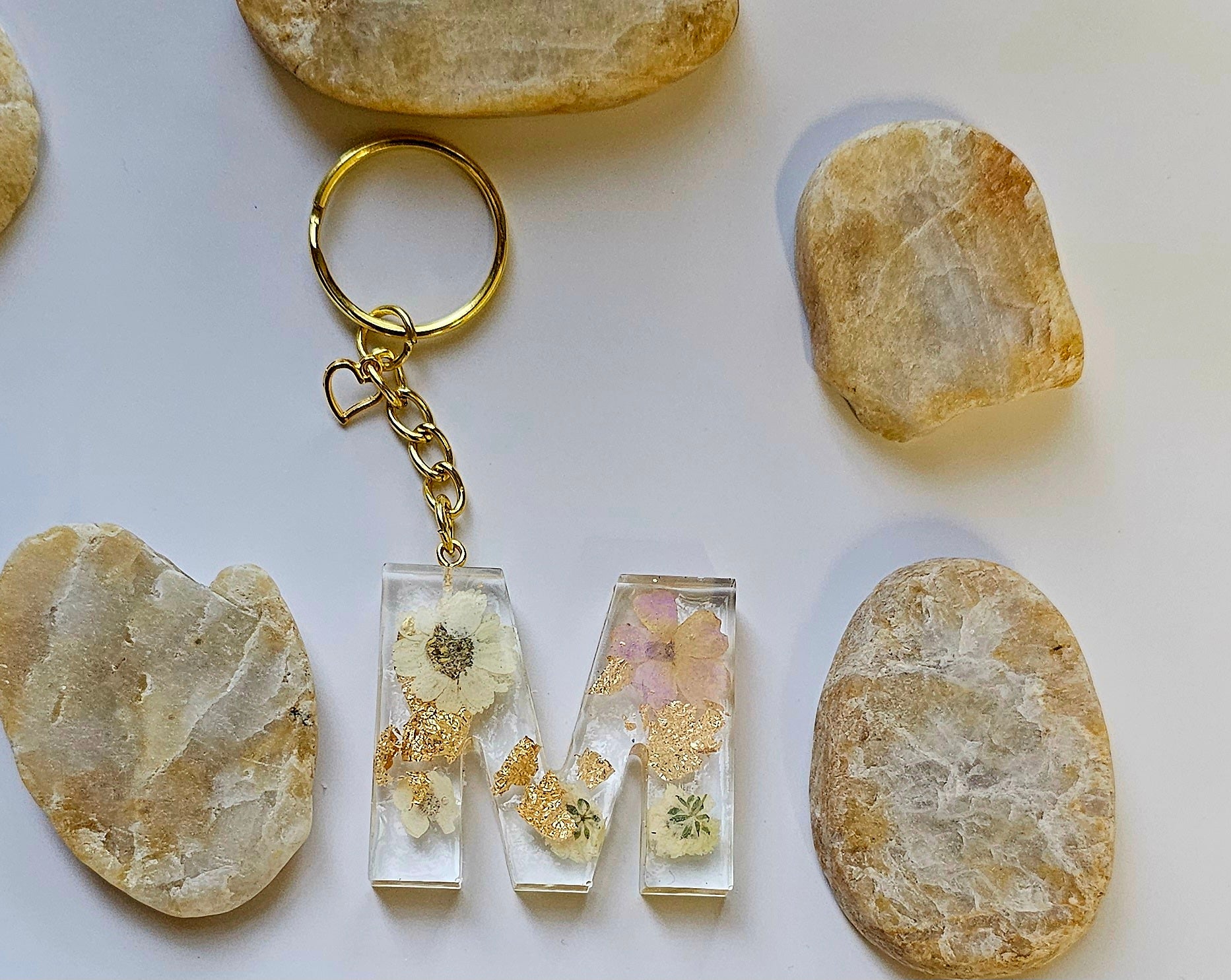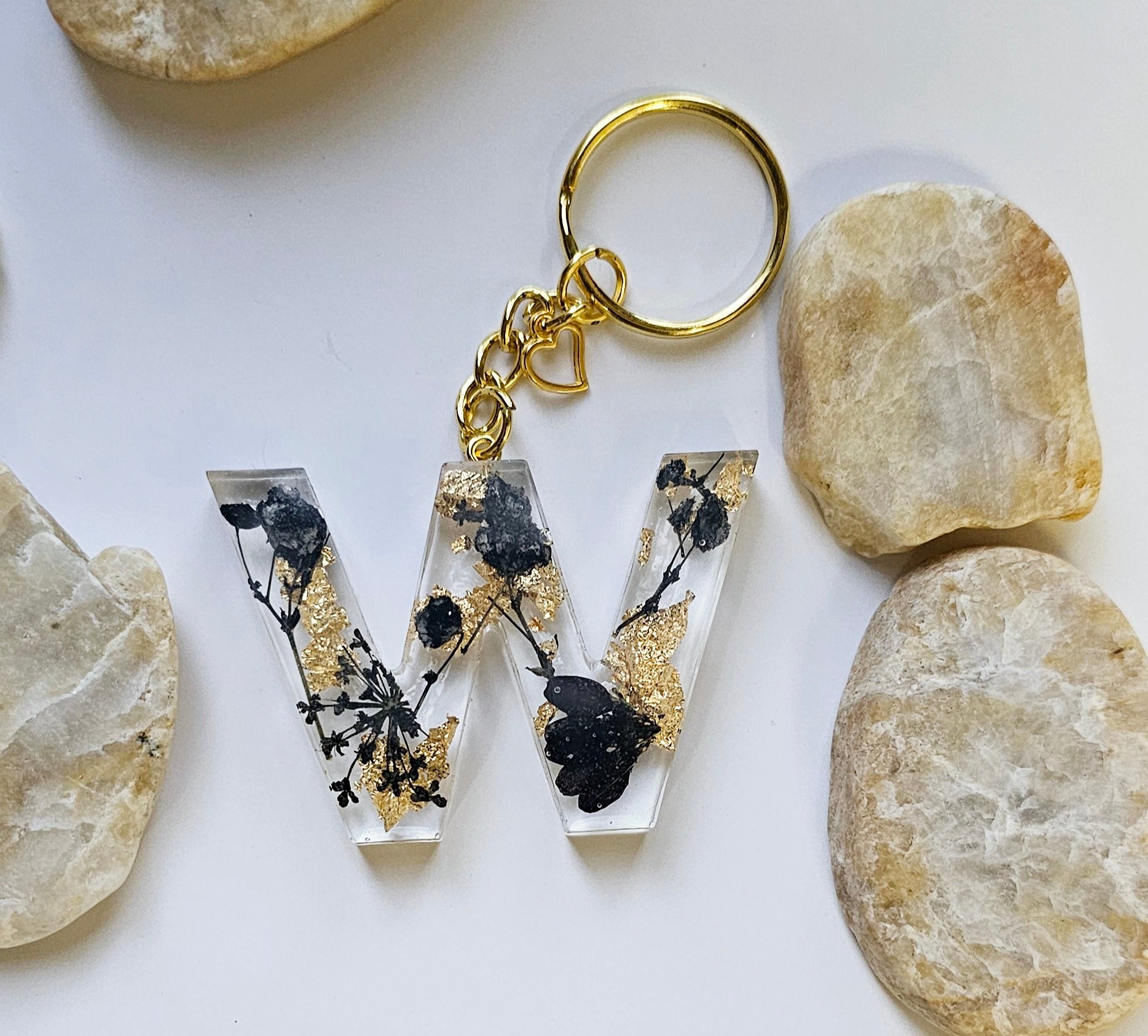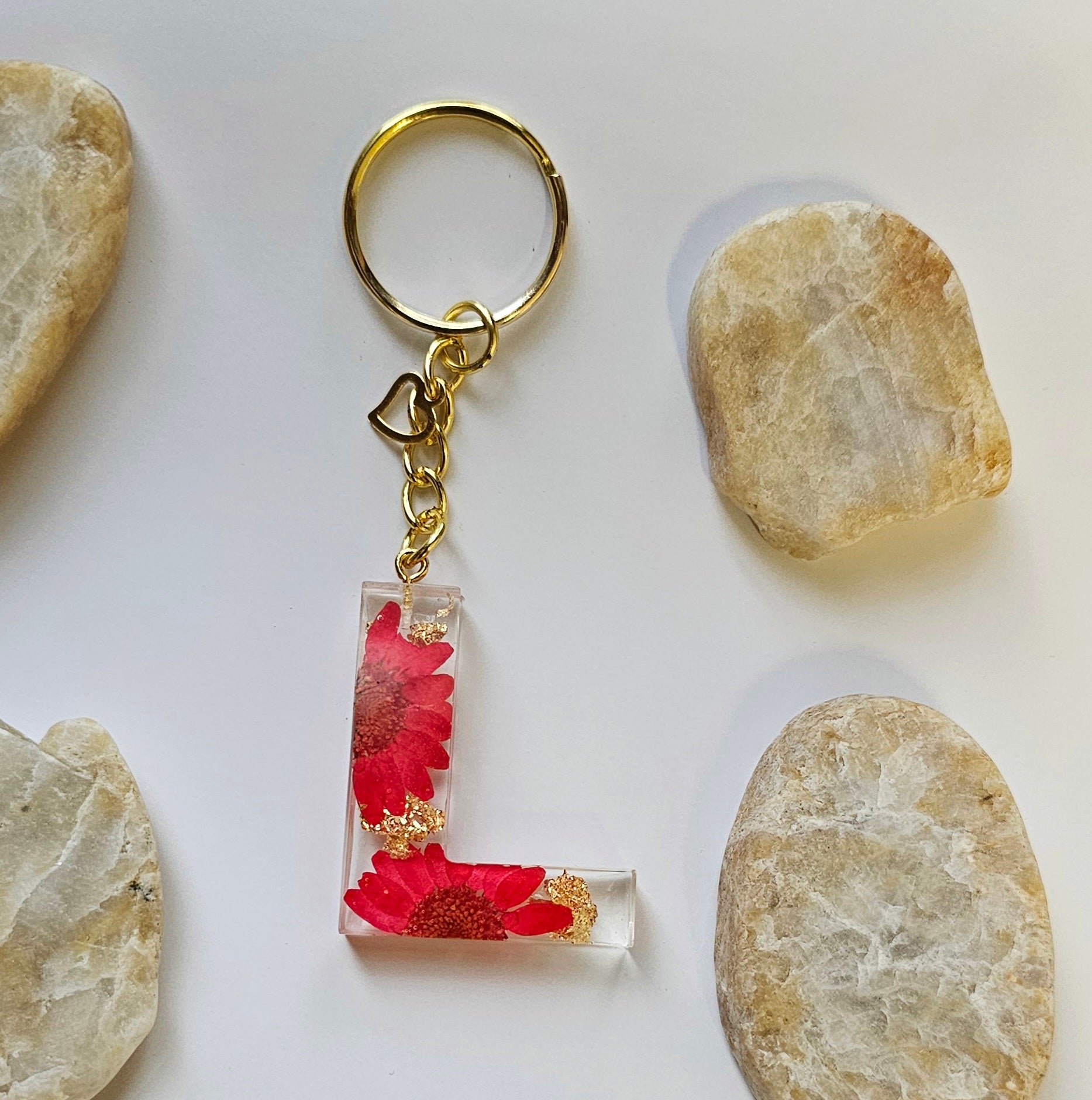 Make a unique statement with a custom Floral Letter Keychain! Handcrafted with real flowers, gold flakes, and clear resin, each one-of-a-kind keychain is an eye-catching accessory. Choose your favorite letter or number for a personalized touch. The perfect gift for stocking stuffers, bridesmaids, and birthdays. Includes one keychain with attached gold chain. Optionally add small leaves and flowers.