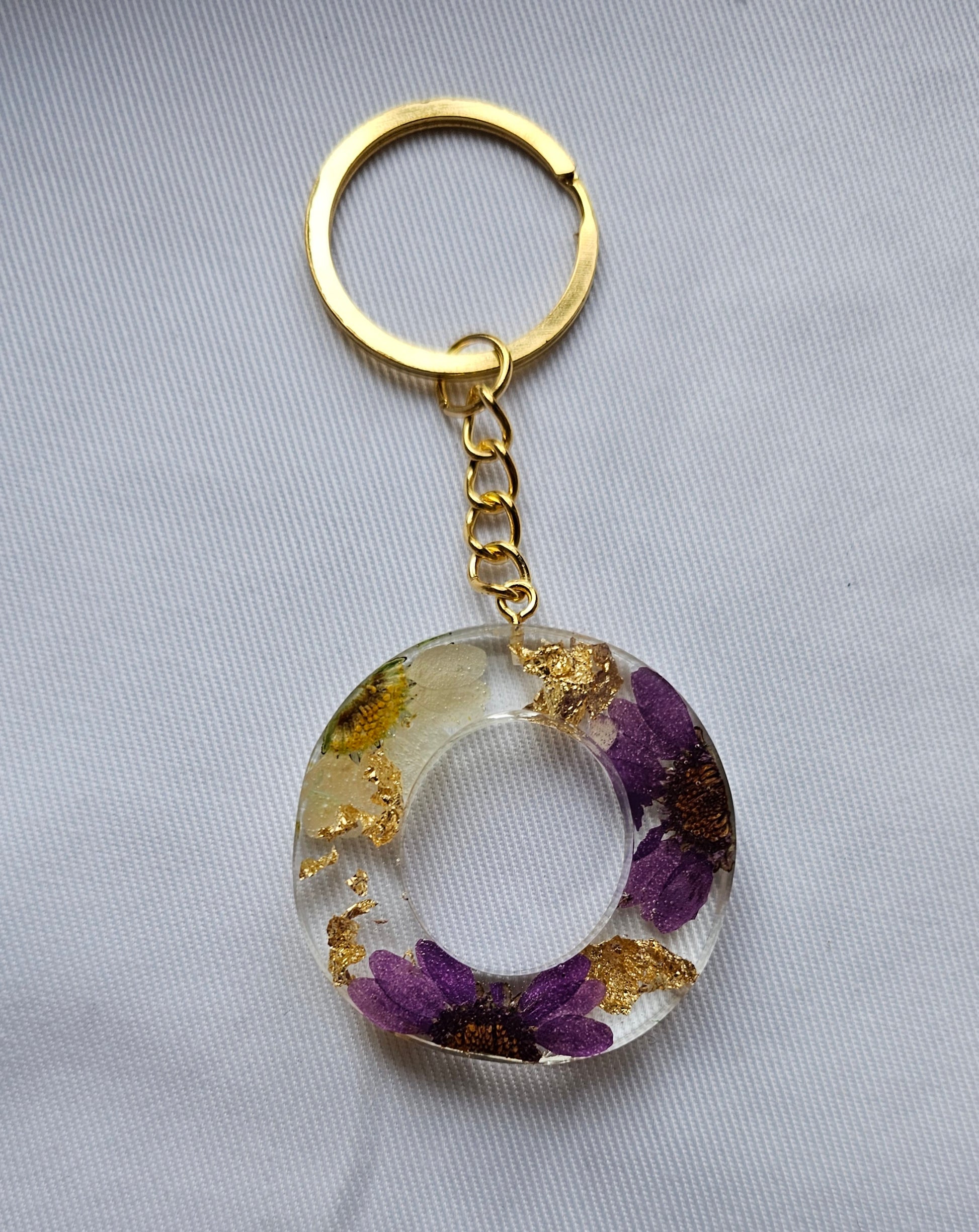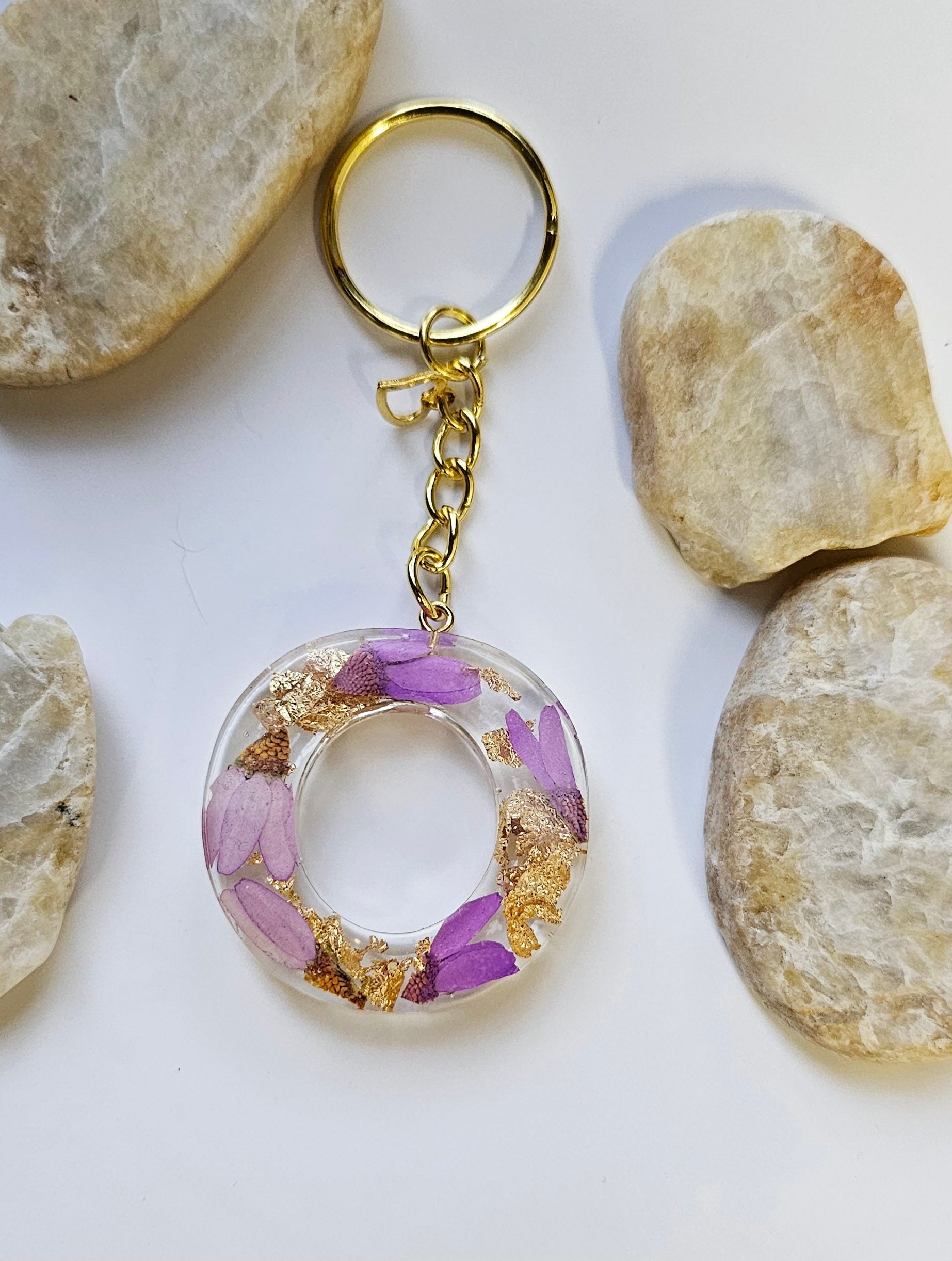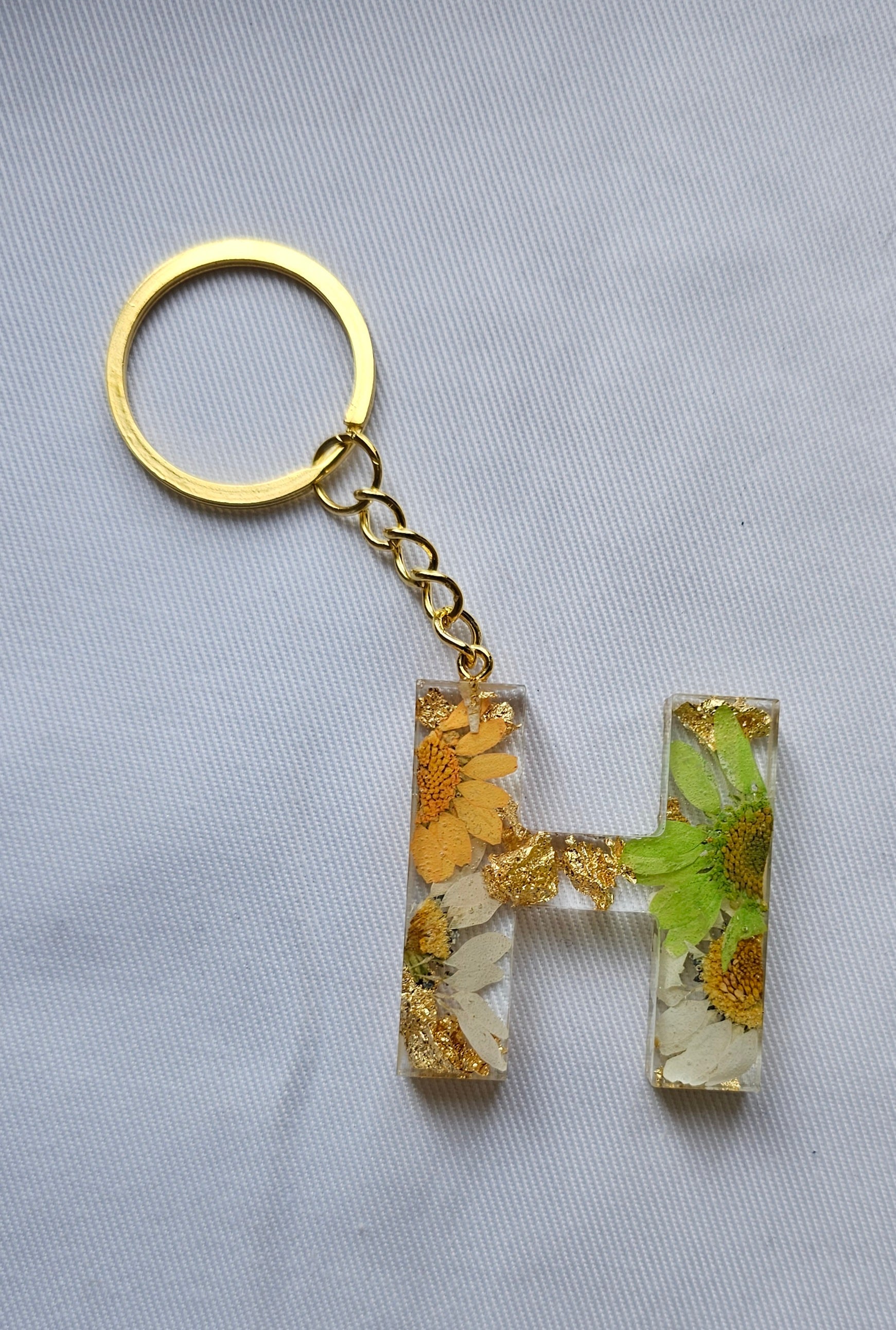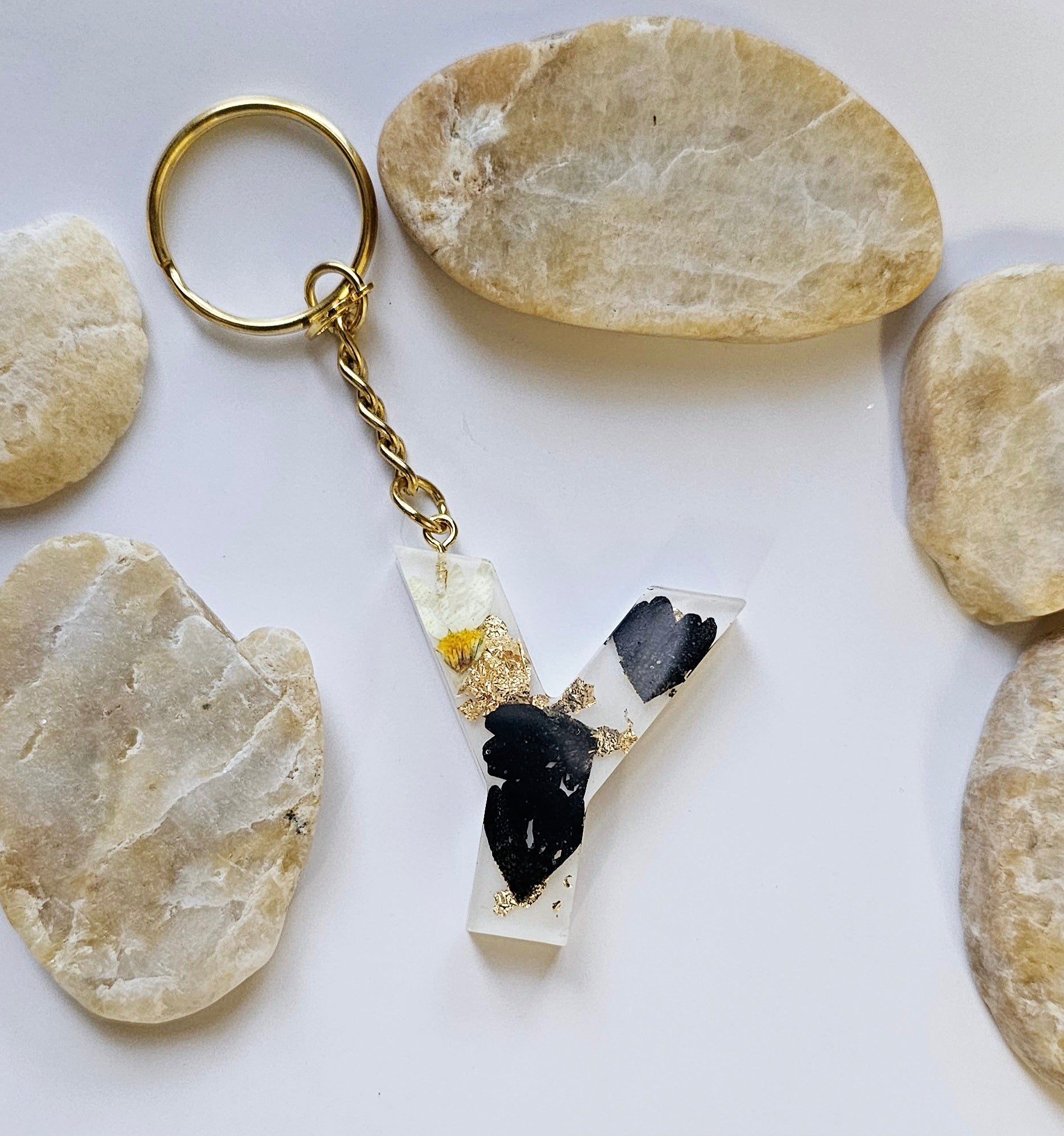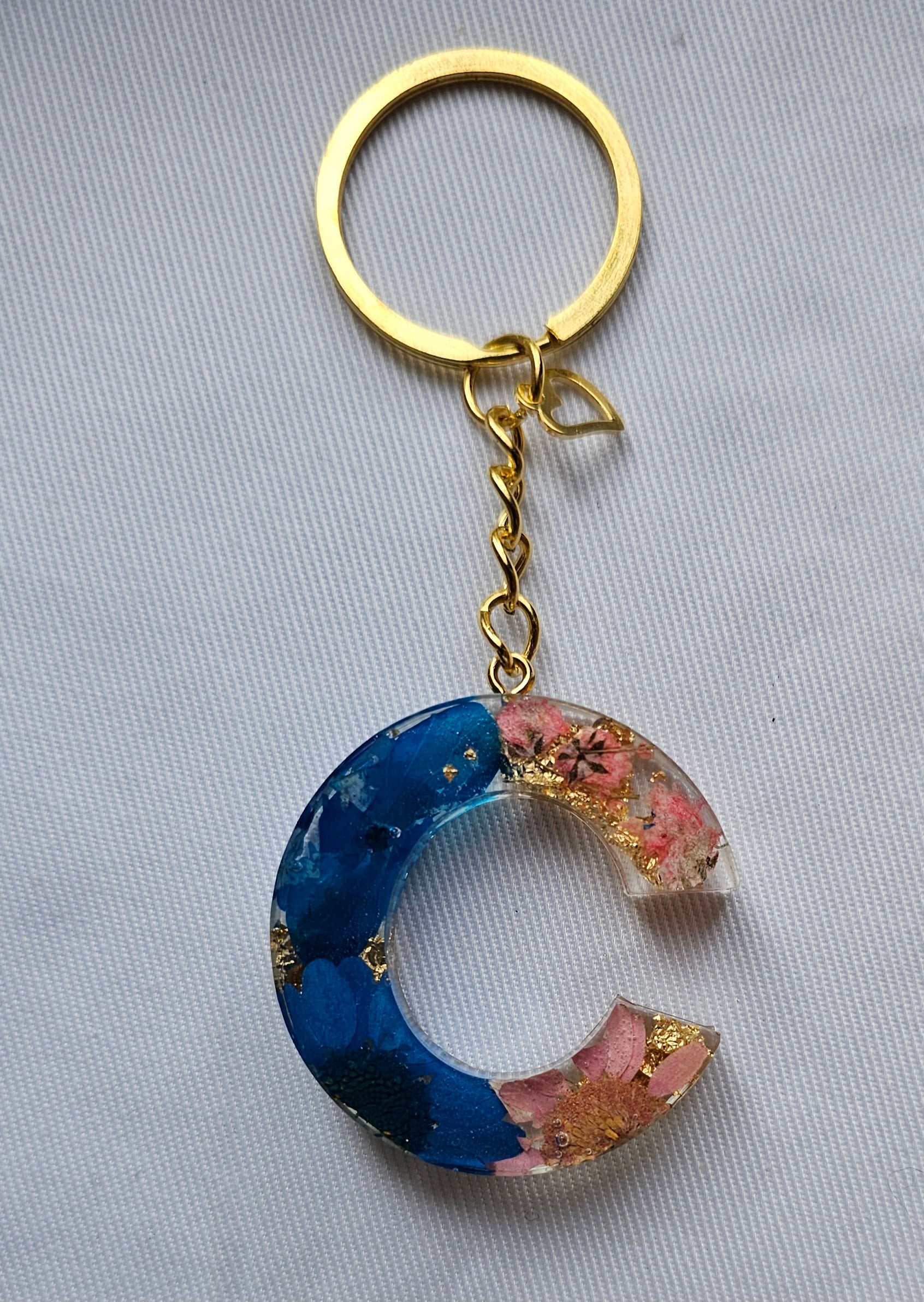 Make a unique statement with a custom Floral Letter Keychain! Handcrafted with real flowers, gold flakes, and clear resin, each one-of-a-kind keychain is an eye-catching accessory. Choose your favorite letter or number for a personalized touch. The perfect gift for stocking stuffers, bridesmaids, and birthdays. Includes one keychain with attached gold chain. Optionally add small leaves and flowers.