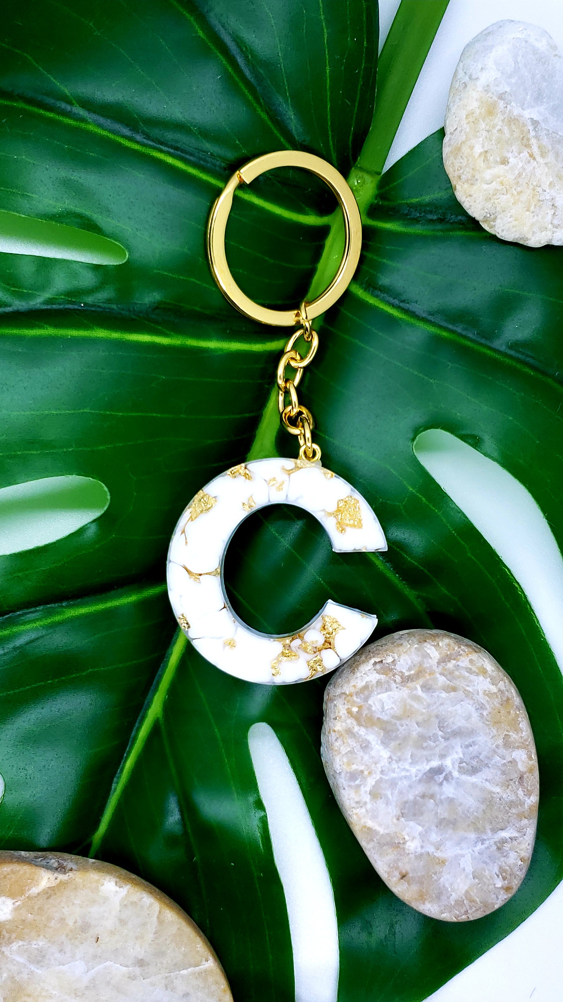 This handmade keychain is crafted with epoxy resin and gold foil flakes, creating a glamorous yet durable accent. Each letter is 1.5” tall and comes with gold hardware, with options for silver or rose gold. Each keychain is unique and custom-made, with small air bubbles and other slight imperfections possible. Shop our selection to find your favorite!