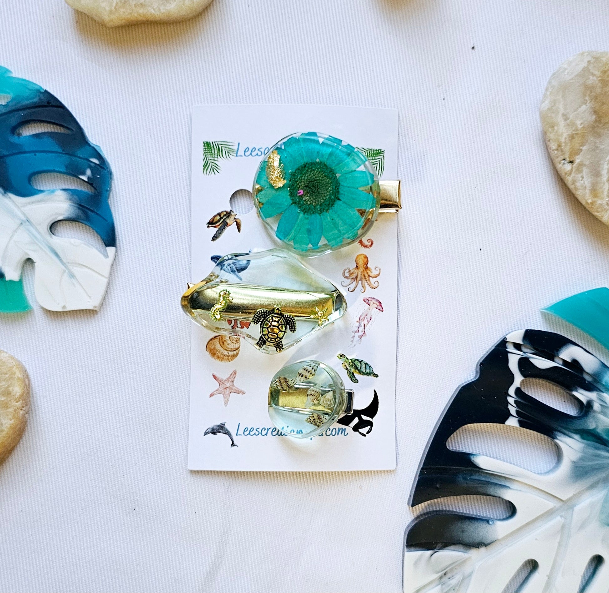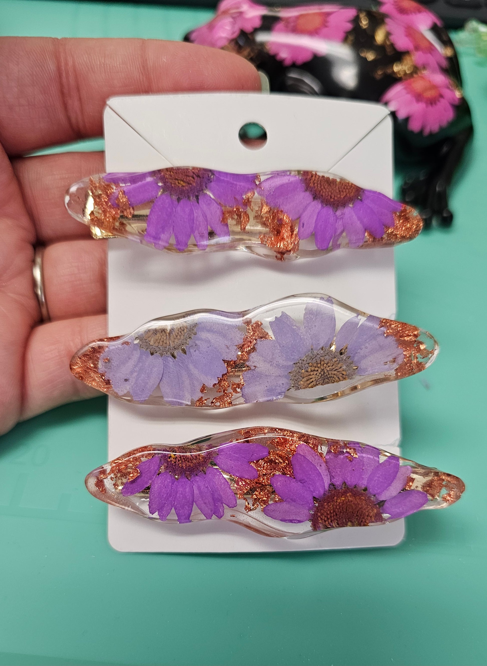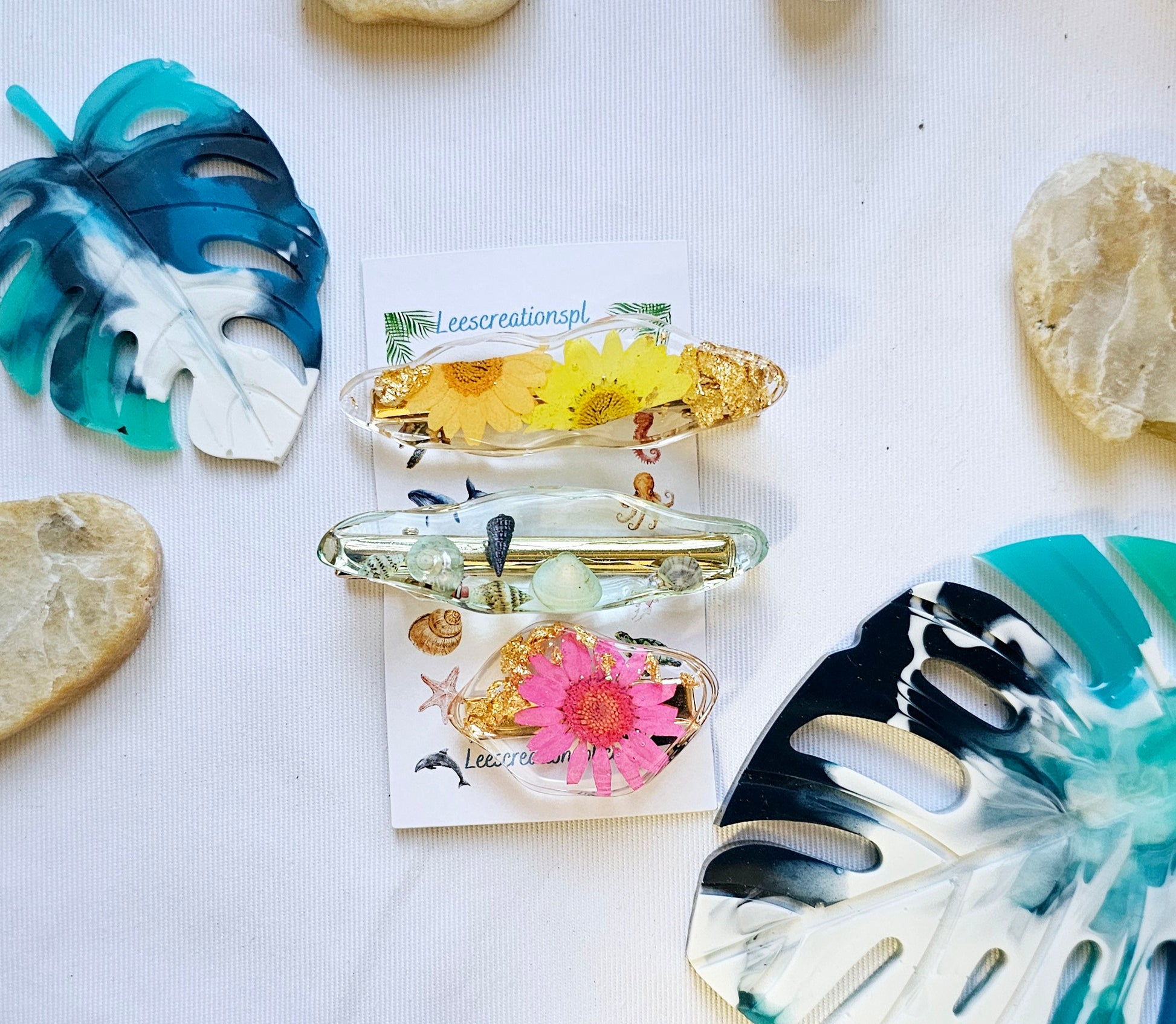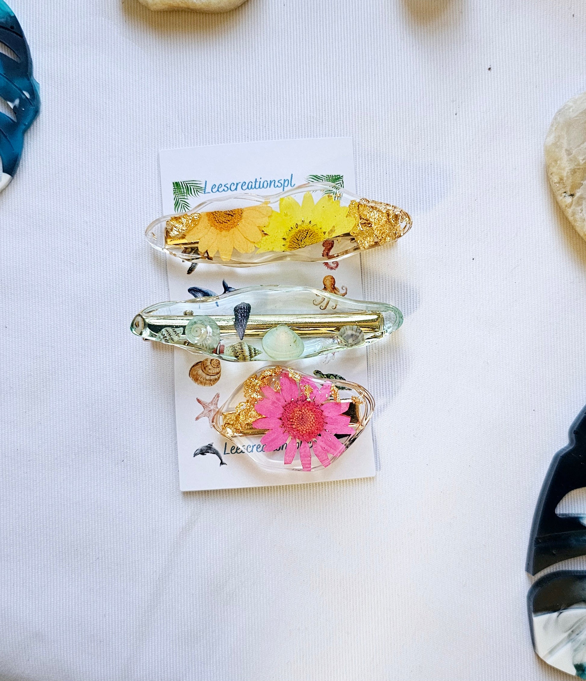 These handmade hair clips are expertly crafted for a personalized touch. Made with attention to detail, these hair clips are perfect for securing your hair in style. Add a unique and elegant touch to your look with these one-of-a-kind hair clips. Set of 3
