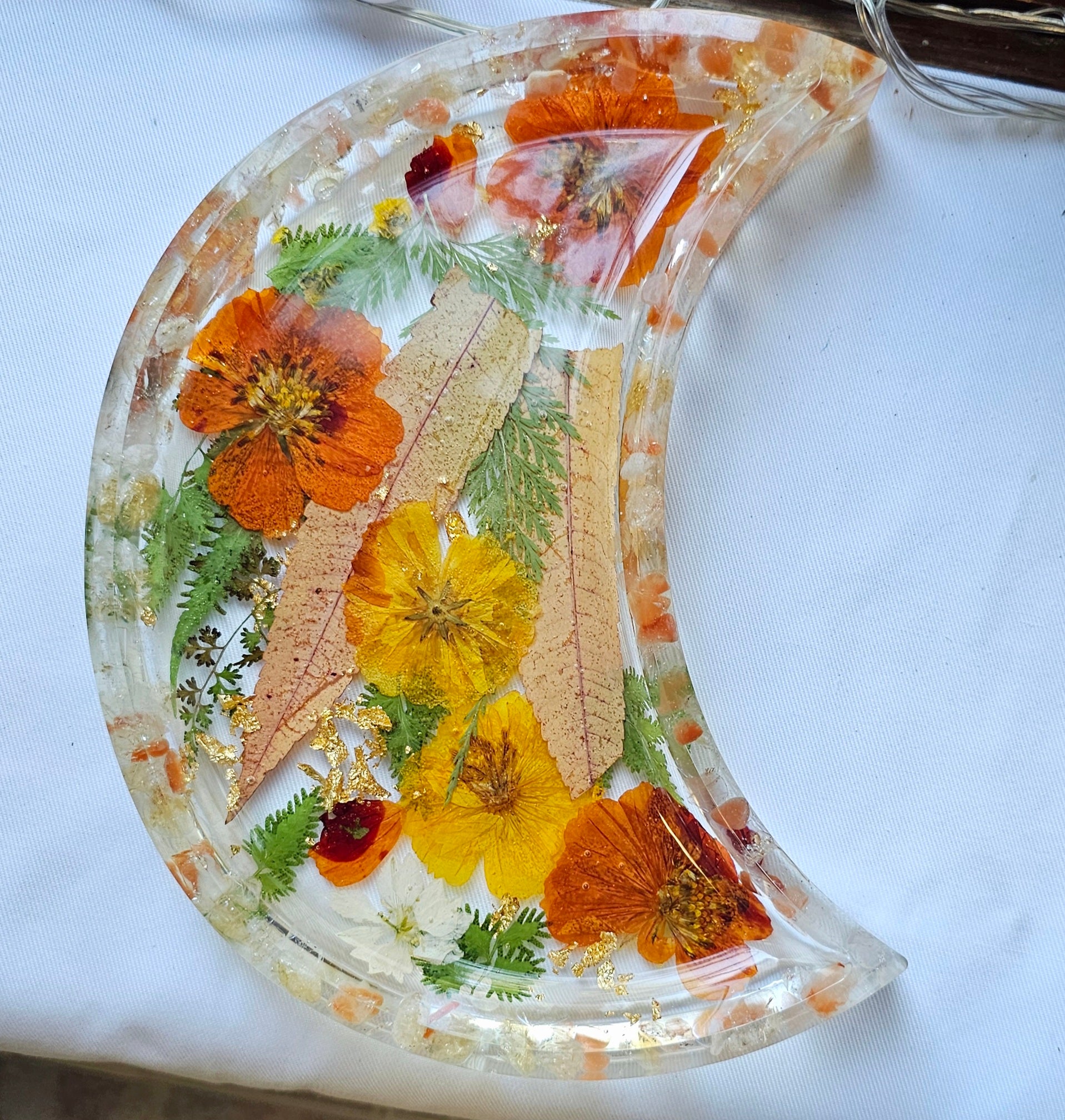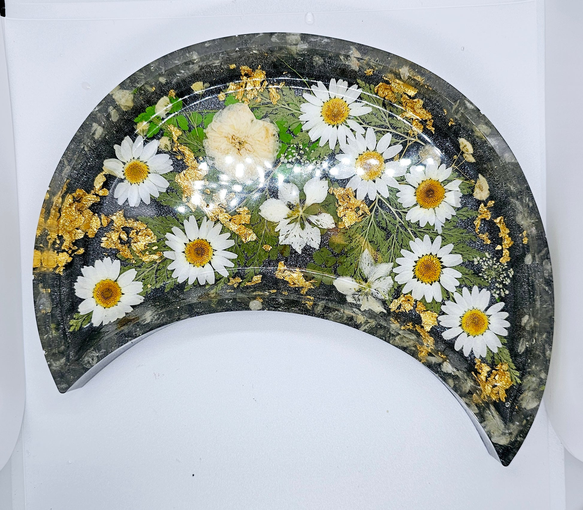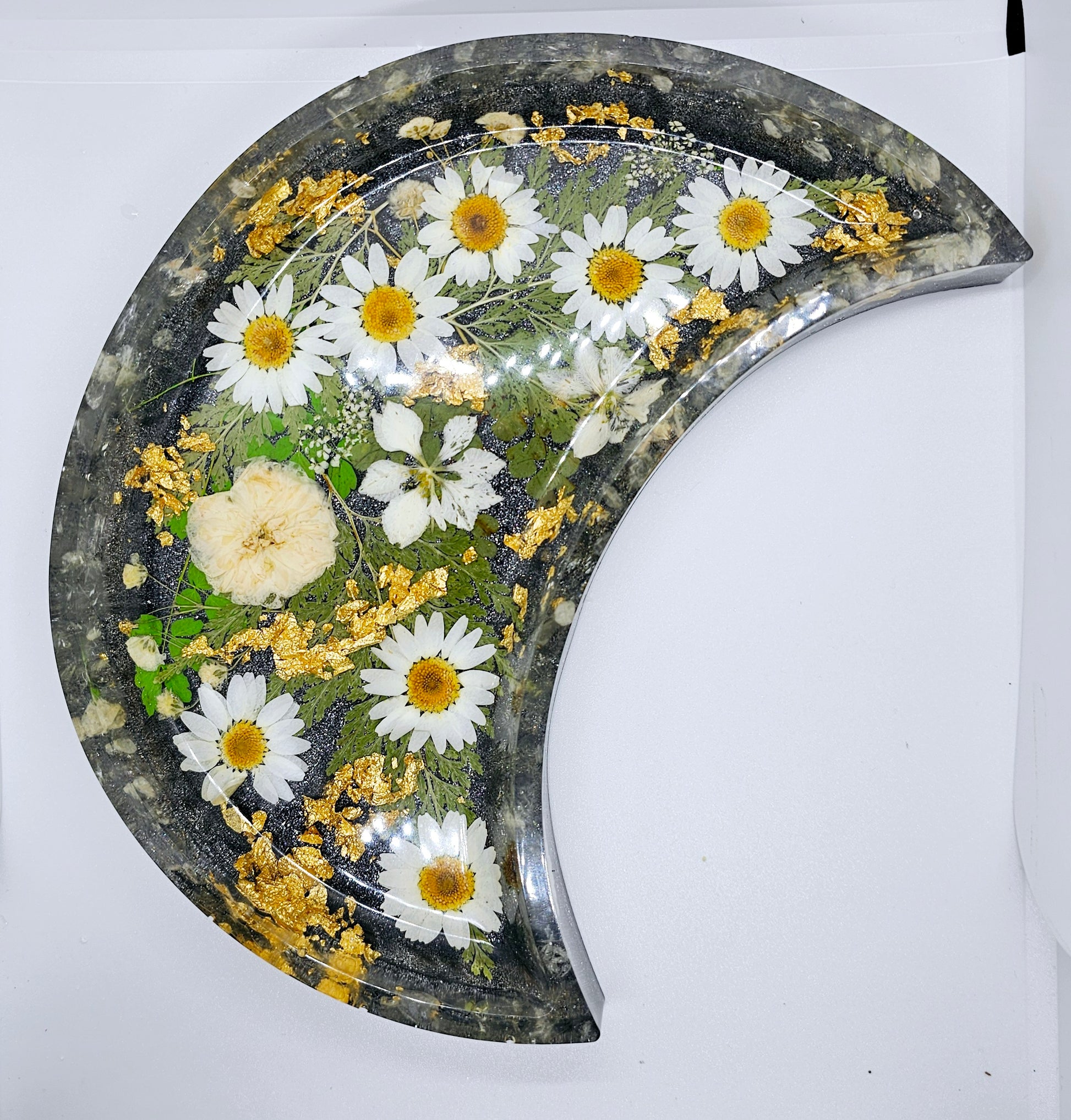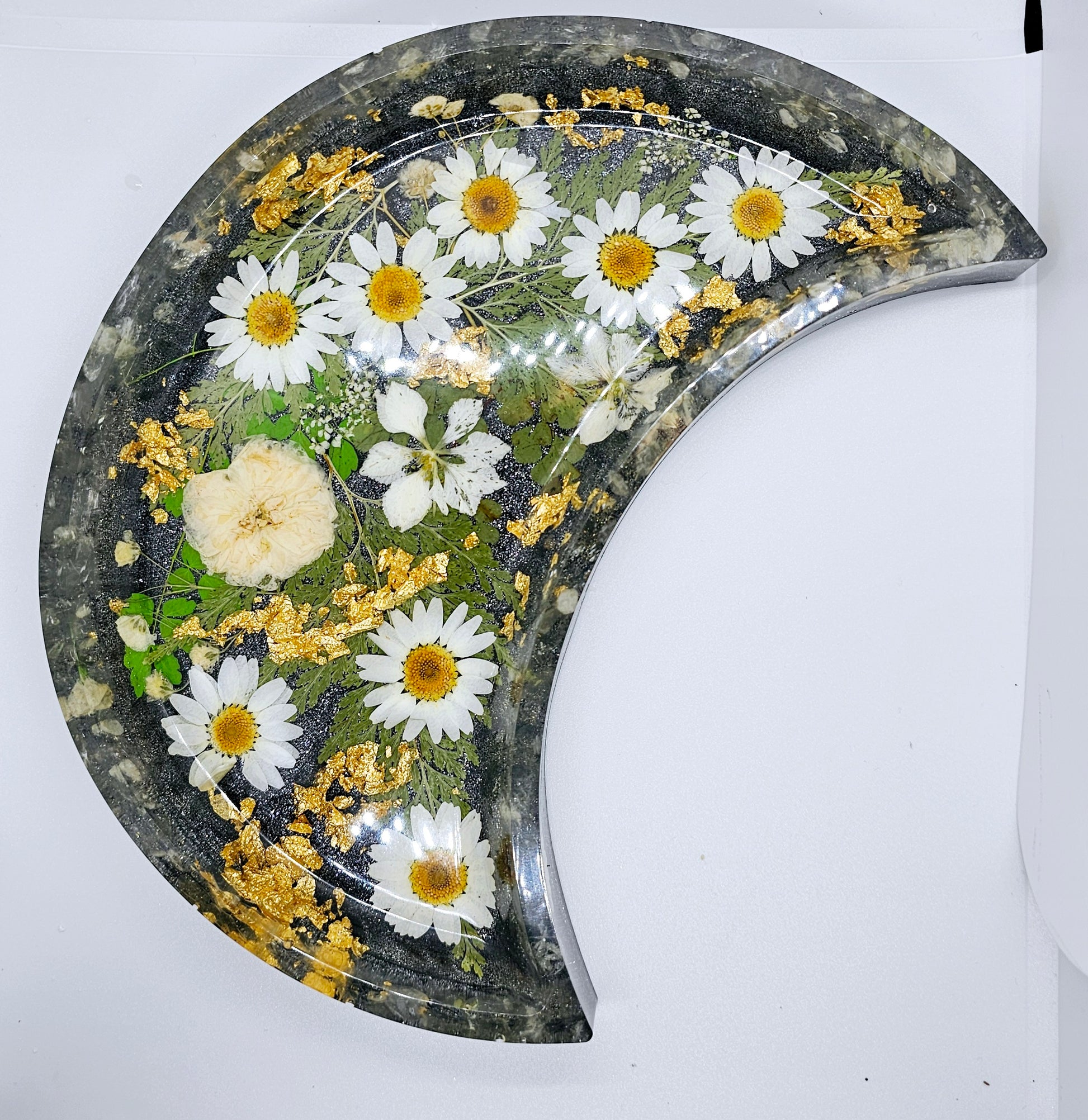 Crafted with resin, these Moon Trays feature intricate designs of delicate flowers, making them both functional and beautiful. The durable material ensures long-lasting use, while the unique design adds a touch of elegance to any space. Perfect for serving or organizing small items, these trays are a must-have for any home.