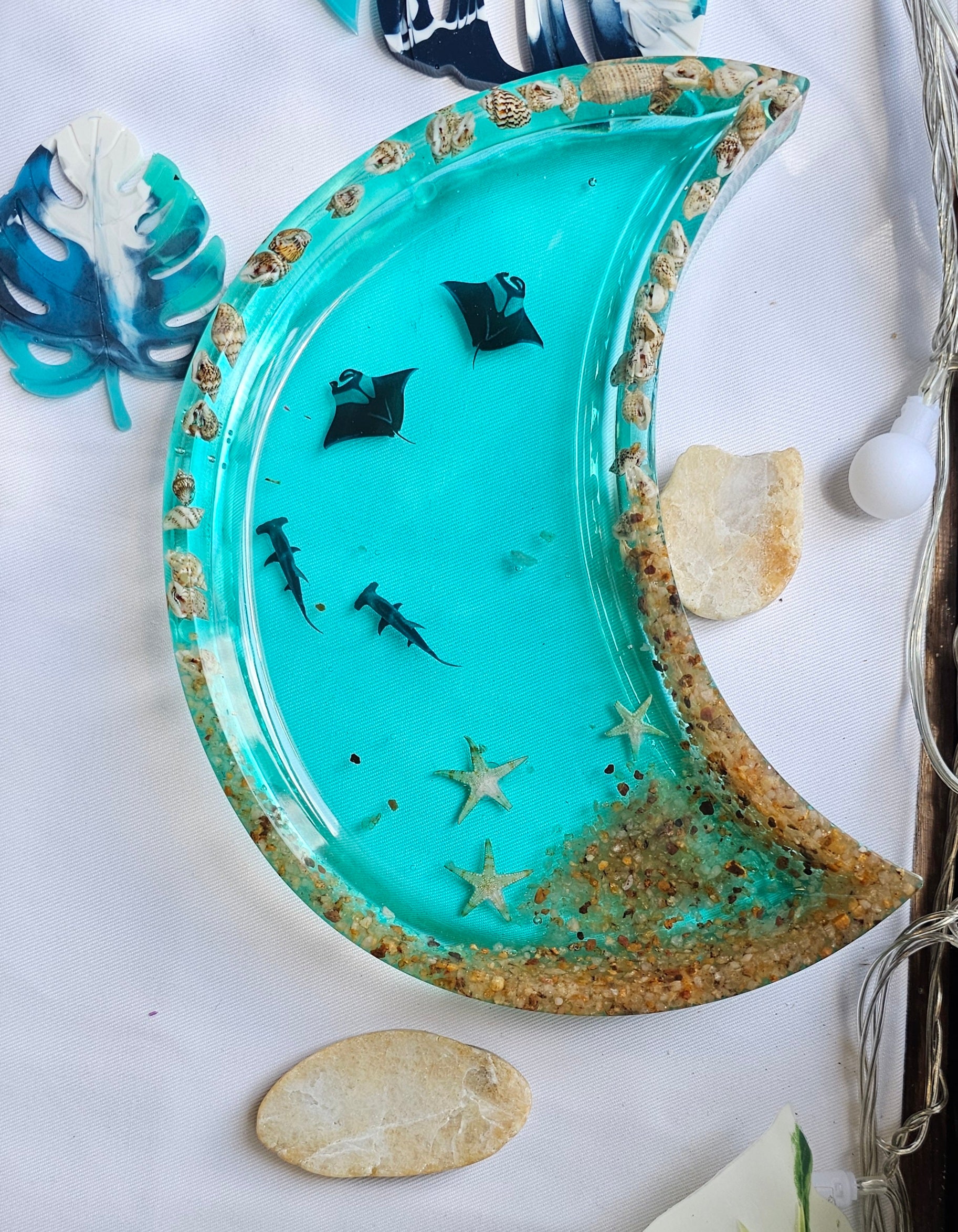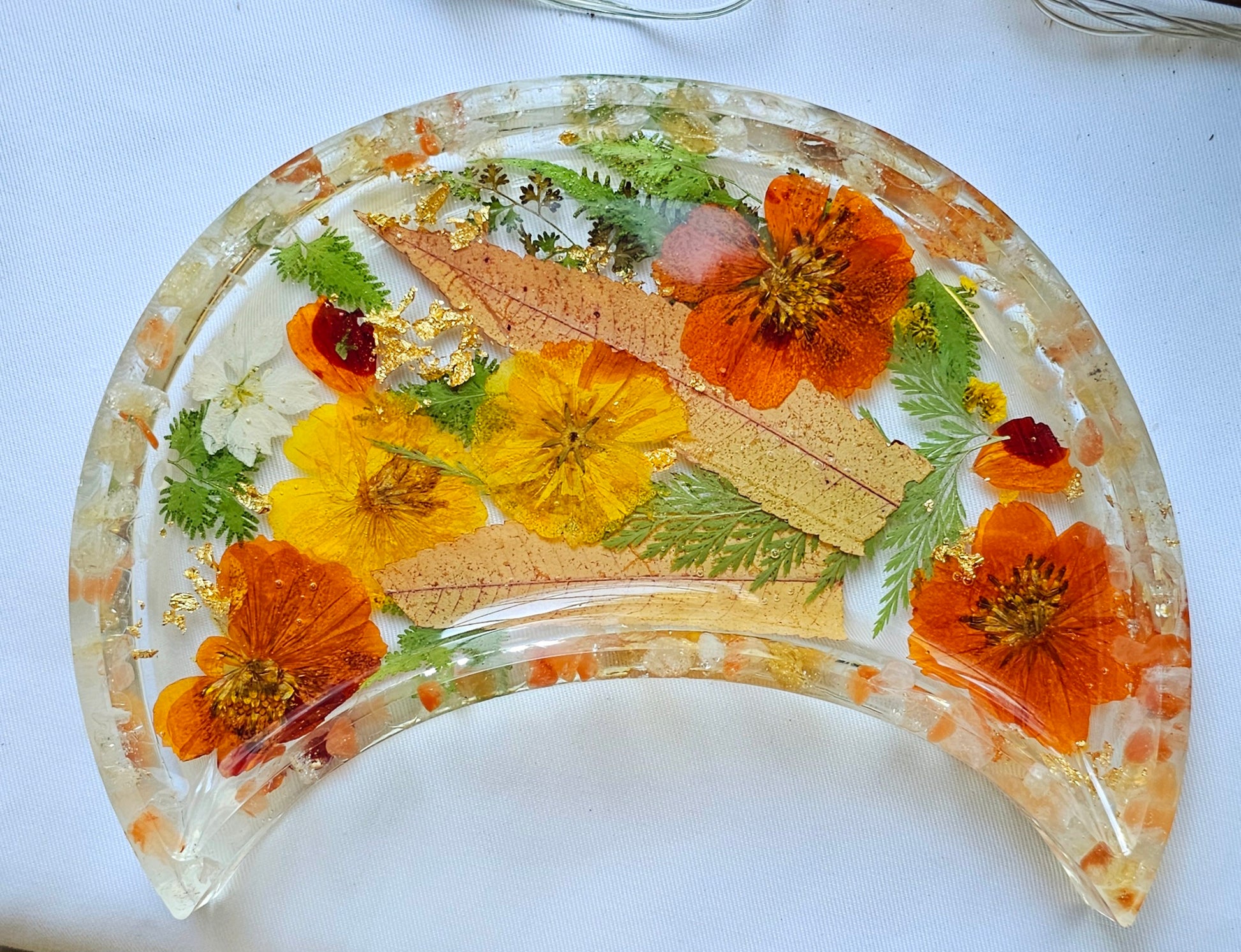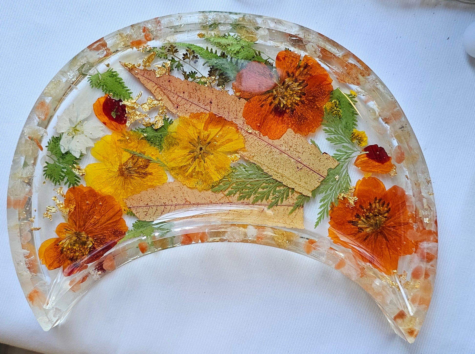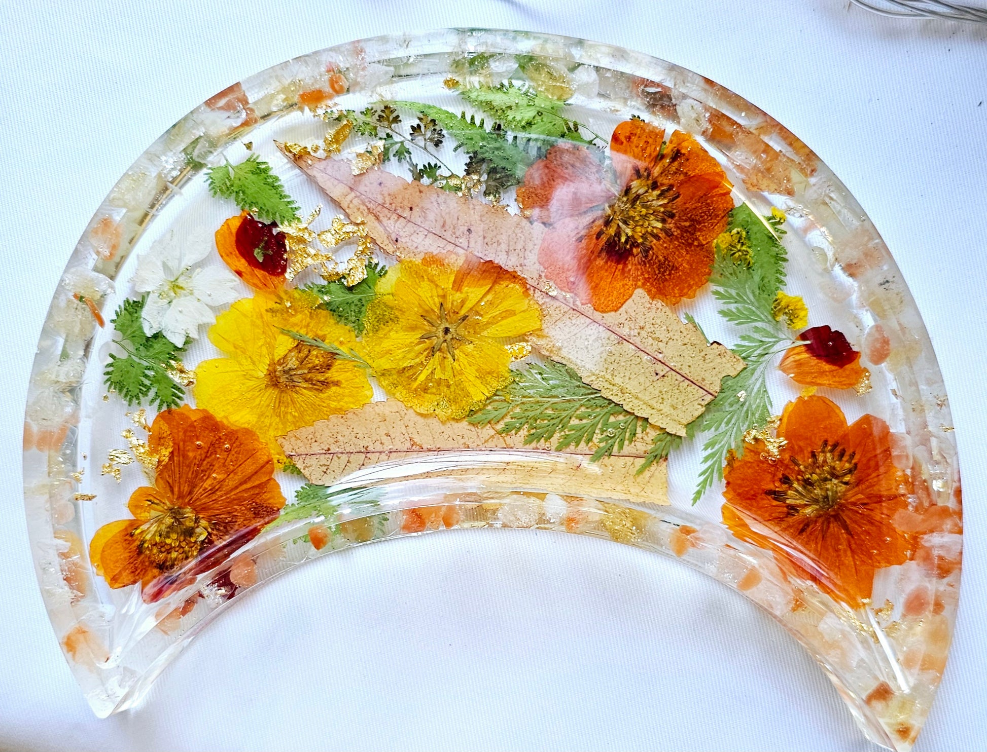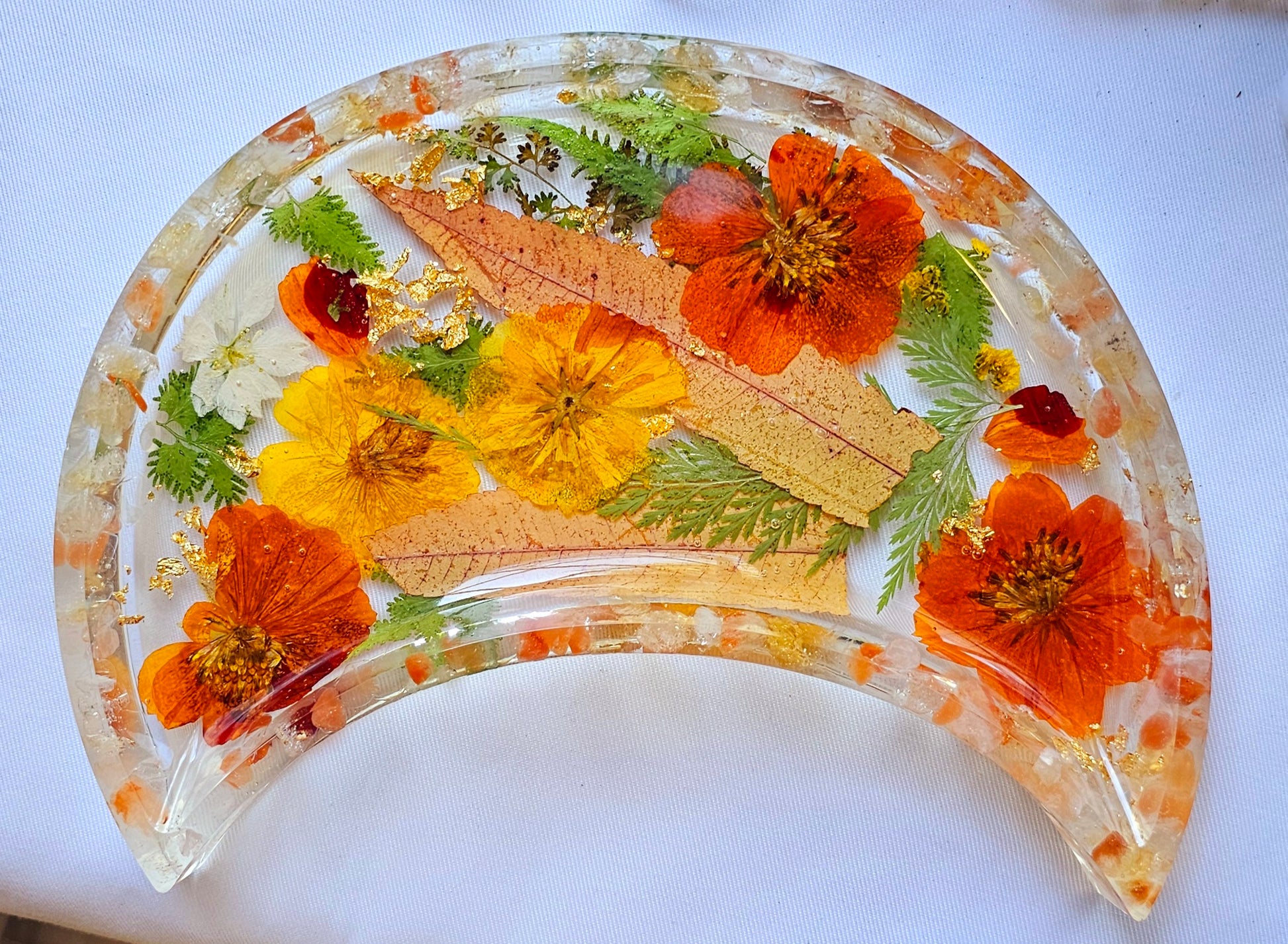 Crafted with resin, these Moon Trays feature intricate designs of delicate flowers, making them both functional and beautiful. The durable material ensures long-lasting use, while the unique design adds a touch of elegance to any space. Perfect for serving or organizing small items, these trays are a must-have for any home.