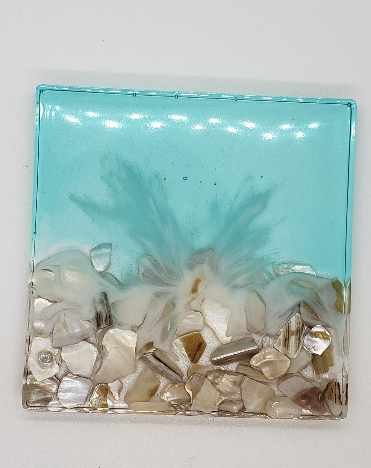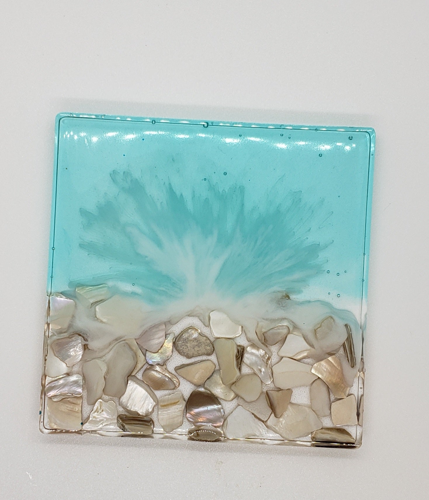 Enjoy a touch of the seaside with these Sea scape coasters with holder. Combining real sand and shells with epoxy resin, each coaster set of 4 is handmade to order and makes a perfect personalized gift for beach lovers. Unique and distinctive, these coasters provide a special keepsake to commemorate family vacations, special occasions, and more.